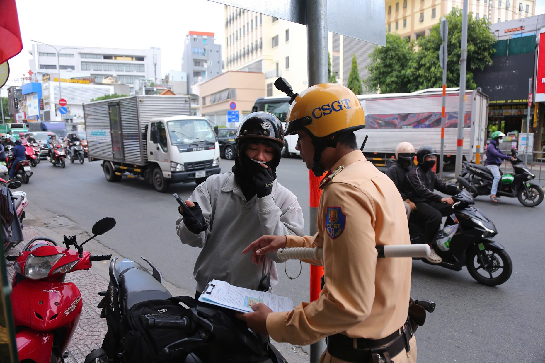 Hành vi nguy hiểm này đã bị tổ công tác phát hiện và yêu cầu dừng xe. Sau khi nghe giải thích về rủi ro, chị T. mới lẳng lặng ký vào biên bản xử phạt.