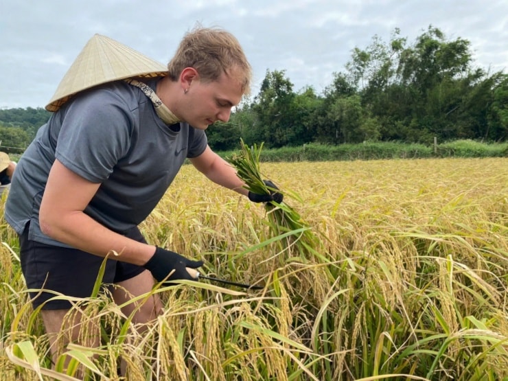 Dù còn đôi chút vụng về, anh Loic Pesquerl không giấu được sự hào hứng: “Được trải nghiệm làm nông dân trên đảo Cô Tô thật tuyệt vời! Tôi được cầm liềm gặt lúa, gánh thóc và cảm nhận nhịp sống bình dị của người dân nơi đây. Cảm giác này tuyệt vời hơn bất cứ tour nào tôi từng tham gia!”
