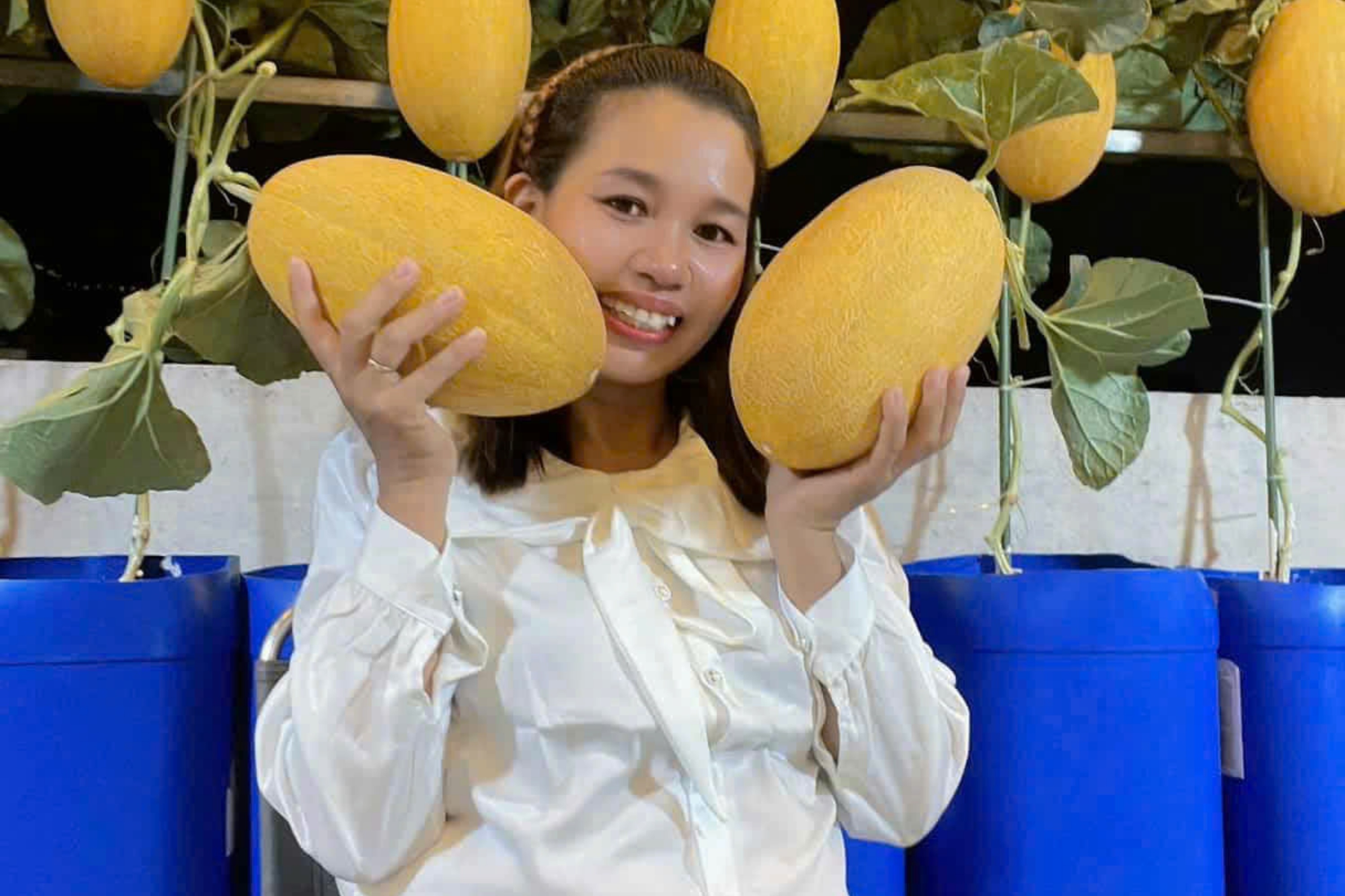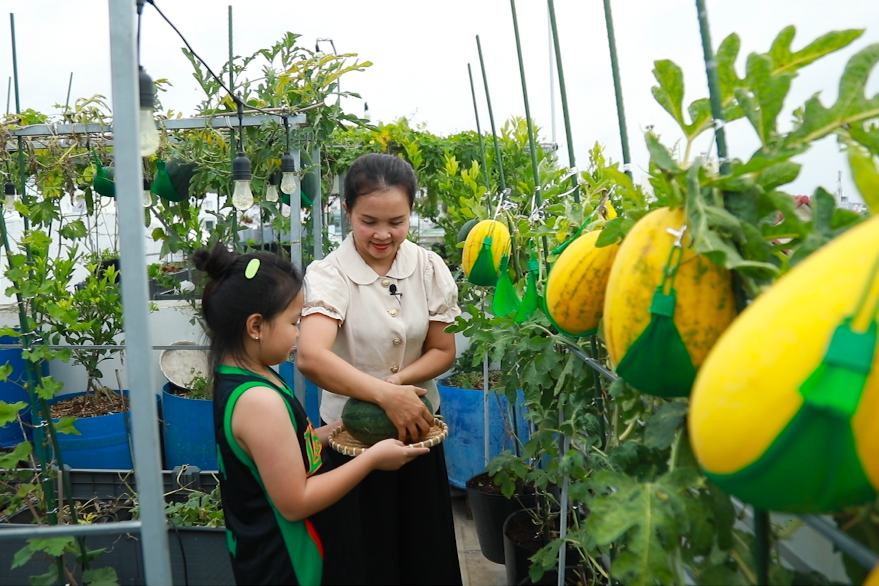 Chị Nhung trồng nhiều loại rau củ quả trên sân thượng, bao gồm các loại rau lá như cải, rau muống, rau thơm, xà lách. Ngoài ra, chị còn trồng trồng dưa lưới, dưa hấu, bí hạt dẻ... mỗi năm thu hai vụ, có vụ đạt hơn 300 kg. Mỗi ngày, chị dành gần 1 tiếng để tưới cây, chăm sóc từng luống rau, giàn bí. Nhờ đó, cả nhà luôn có sẵn rau xanh, quả ngọt để ăn, thậm chí còn "ăn không hết" và phải mang cho họ hàng.