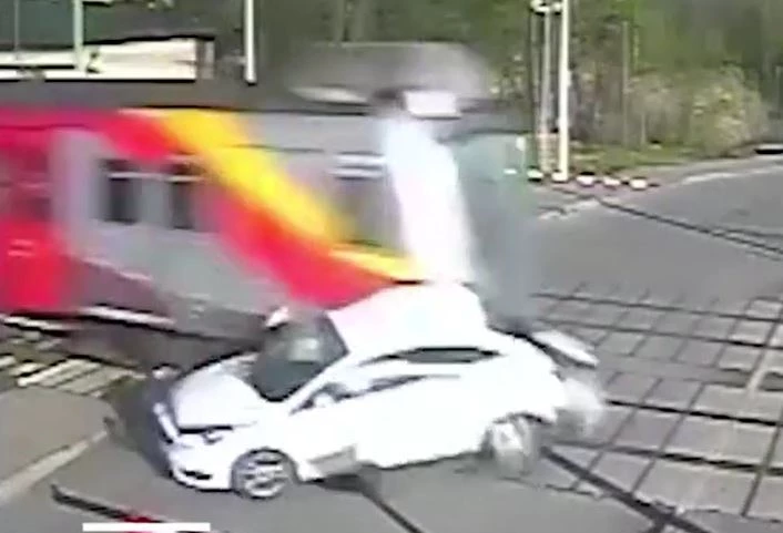 Dù vậy, tài xế vẫn cố tình phớt lờ các tín hiệu an toàn và điều khiển phương tiện băng qua. Đúng lúc đó, một đoàn tàu lao tới với tốc độ cao đã đâm trúng phần đuôi chiếc xe.
