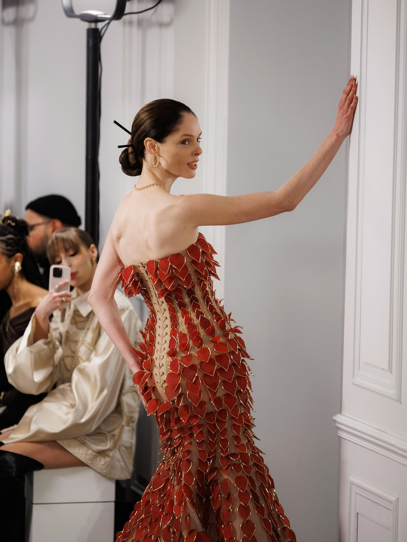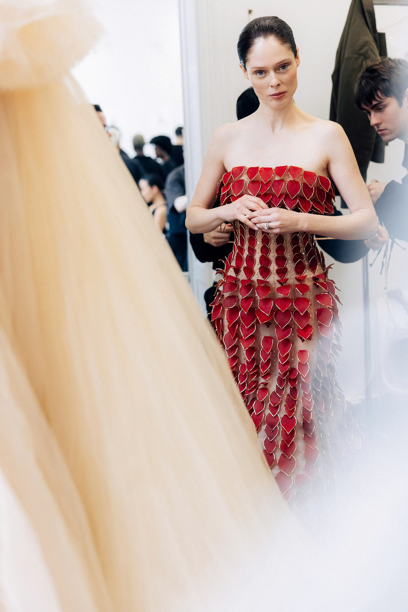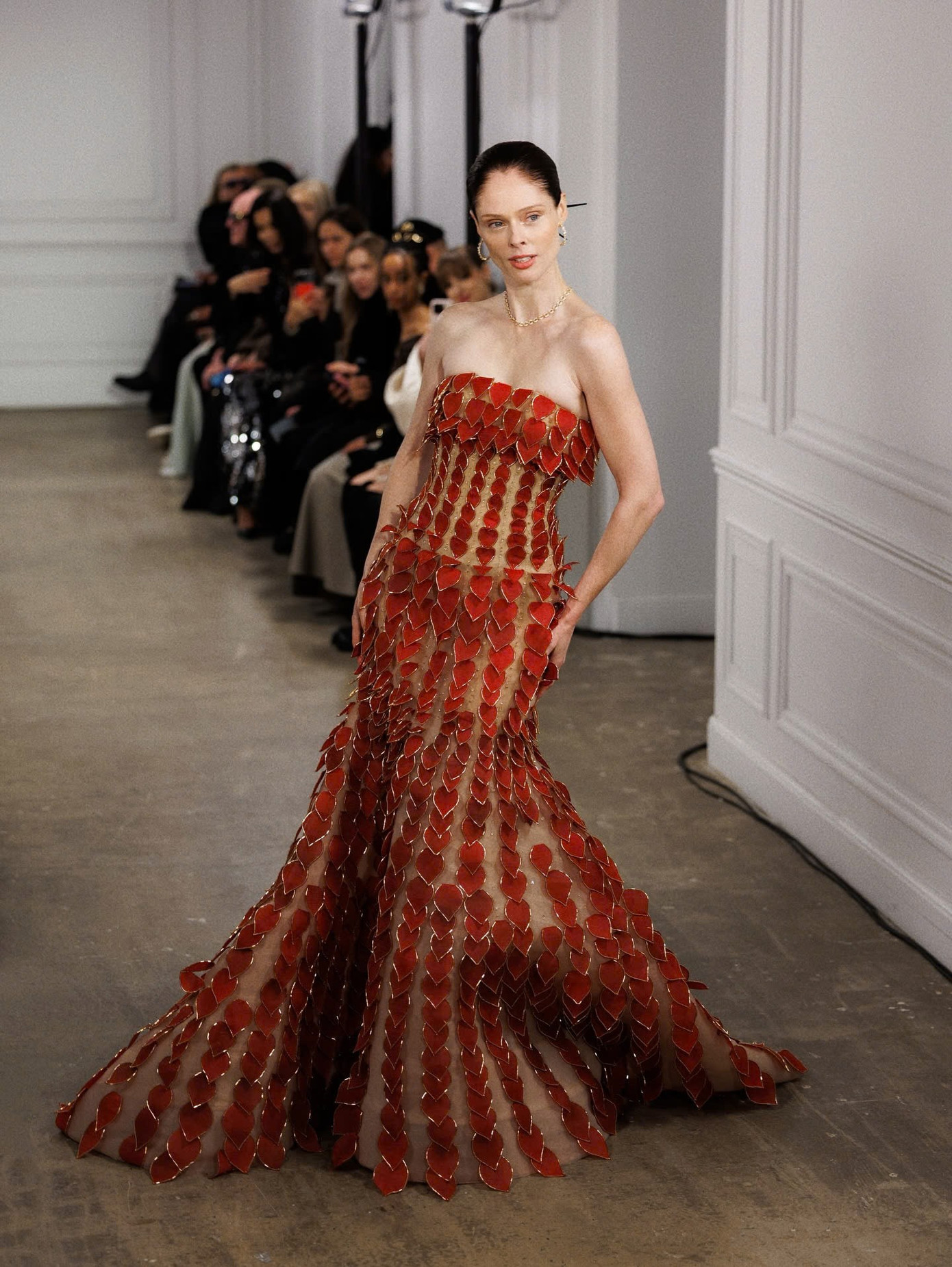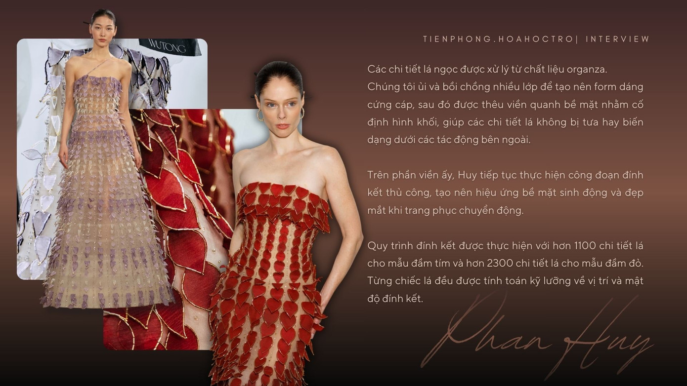 Nhóm nghệ nhân thủ công đã xử lý tổng cộng tới hơn 3400 chi tiết lá từ chất liệu organza bồi nhiều lớp cho mẫu đầm tím chuyển sắc trắng và thiết kế đính lá đỏ do siêu mẫu Coco Rocha trình diễn.