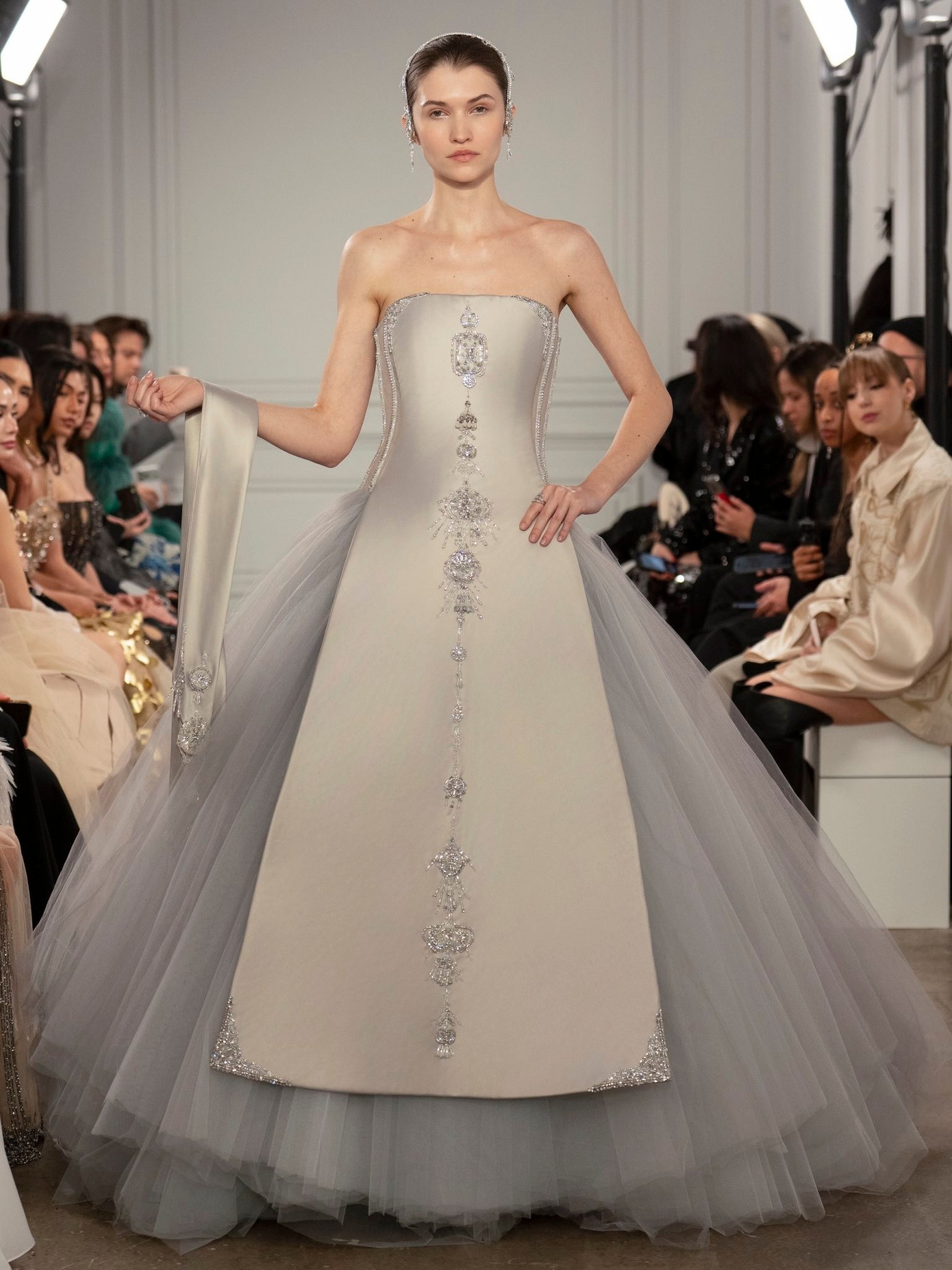 Đội ngũ sáng tạo sắp xếp tỉ mỉ chi tiết horsehair braid thành các hoa văn lồng ghép phức tạp trên thân váy nhằm tạo cảm giác trong trẻo và nhẹ nhàng. "Chúng tôi phải dàn dựng toàn bộ cấu trúc trước, tính toán chính xác độ dài từng đoạn sợi nhằm đảm bảo phom dáng hoàn hảo nhất" - Phan Huy nhấn mạnh.