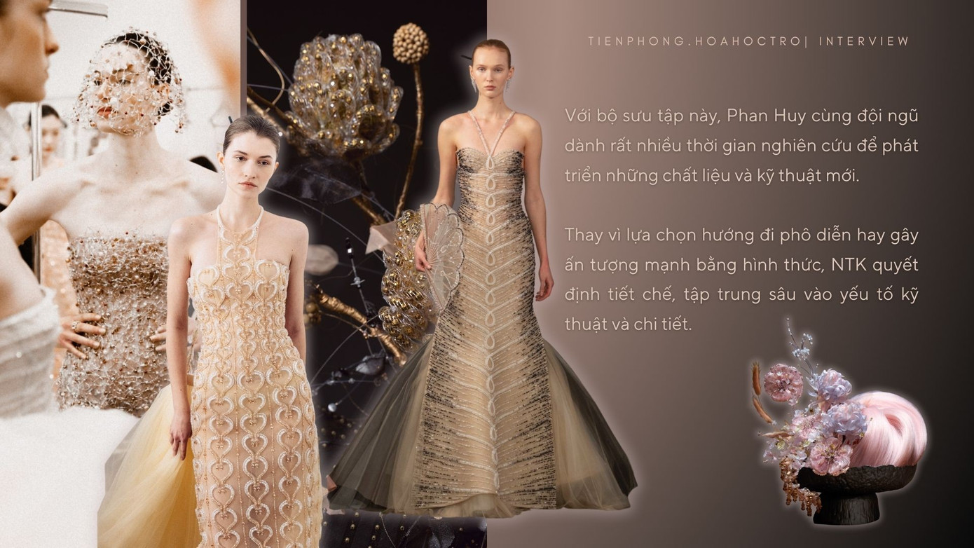 Để đáp ứng những chuẩn mực khắt khe của Liên đoàn Haute Couture (FHCM), Phan Huy cùng đội ngũ dành hơn 5 tháng miệt mài nghiên cứu ý tưởng đến phát triển chất liệu. NTK Việt tập trung sâu vào yếu tố kỹ thuật, đẩy giới hạn tay nghề lên mức cao nhất.