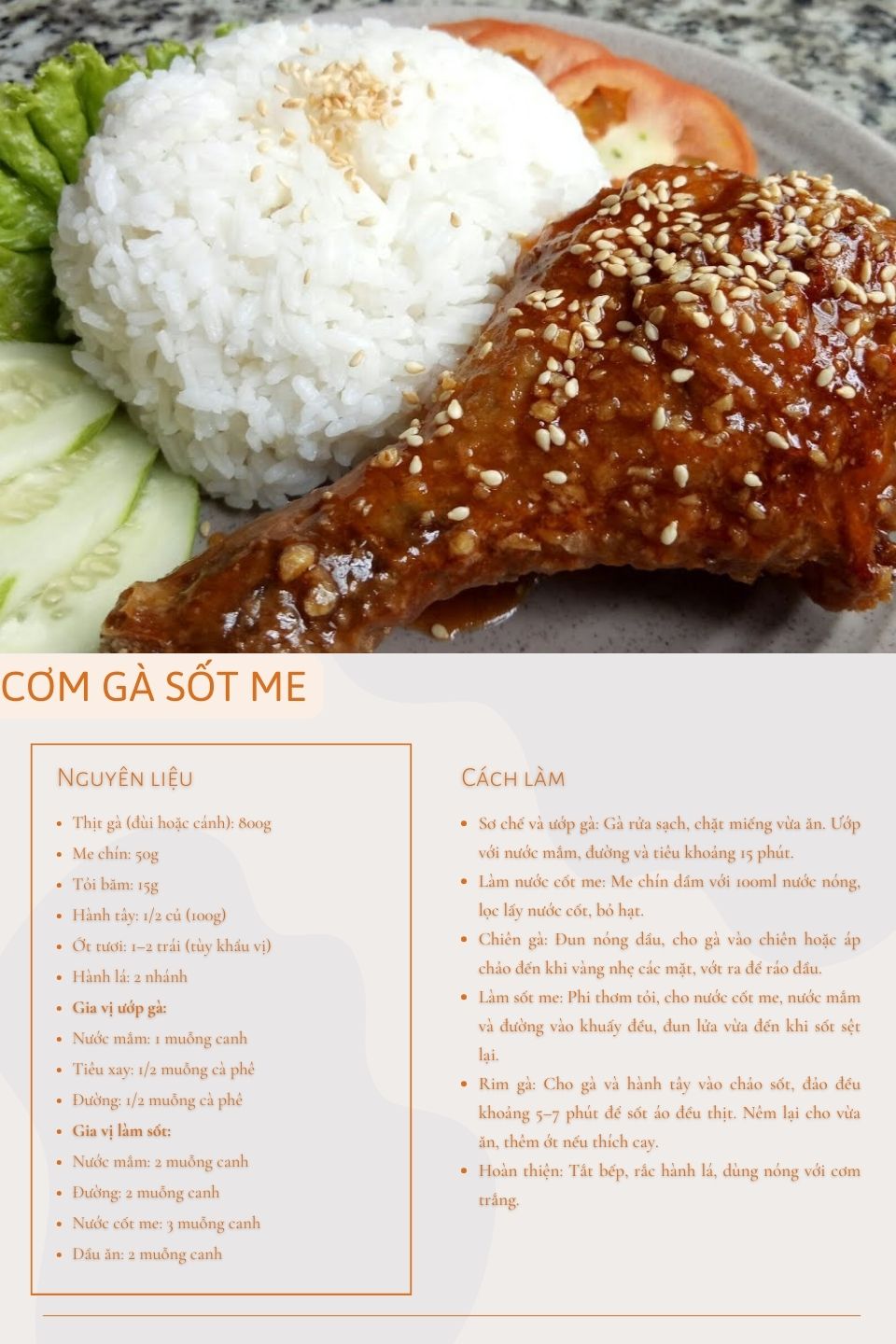 Khi bày ra đĩa, gà sốt me có màu nâu óng, lớp sốt sánh bao quanh từng miếng thịt. Món ăn này đặc biệt phù hợp dùng với cơm trắng, kèm thêm dưa leo, cà chua hoặc rau luộc để cân bằng vị.