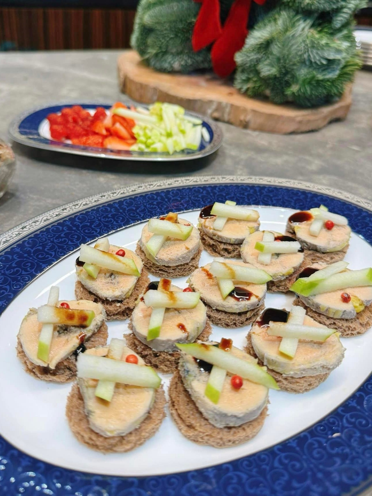 Giáng sinh năm 2024 và 2023, nữ diễn viên đều bày tiệc ấm cúng với sandwich gan ngỗng. Phần gan ngỗng được phết mịn, đặt lên sandwich ngũ cốc tạo hình tròn. Bên trên trang trí bằng quả táo thái sợi và sốt tương. Trên thị trường, gan ngỗng có mức giá tương đối cao, dao động 1,9-3,9 triệu đồng/kg.
