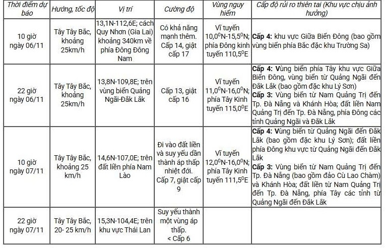Từ gần sáng 6/11, vùng biển từ Nam Quảng Trị đến Khánh Hòa (bao gồm khu vực Lý Sơn, Cù Lao Chàm) gió mạnh dần lên cấp 6-7, sau tăng lên cấp 8-11, vùng gần tâm bão cấp 12-14, giật cấp 17. Sóng biển cao 4-6 m, gần tâm bão 6-8 m; biển động dữ dội.