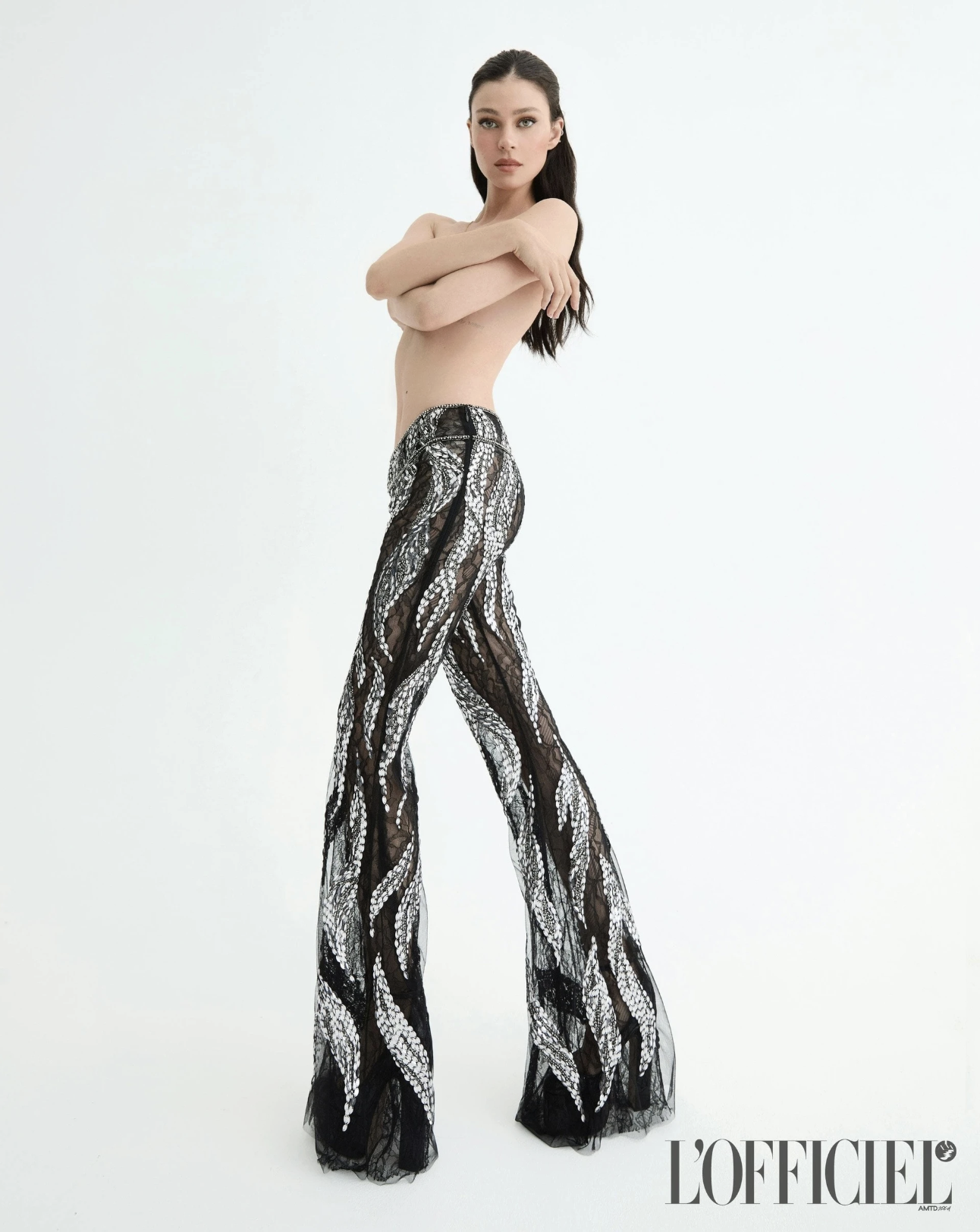 Trước đó, vợ Brooklyn Beckham cũng từng bán khỏa thân khi chụp ảnh bìa tạp chí L’Officiel phiên bản Italy, số phát hành tháng 12/2024. Nữ diễn viên diện chiếc quần in họa tiết cạp cao, dùng hai tay ôm chặt vòng một, tạo dáng quay nửa người về phía ống kính máy ảnh.