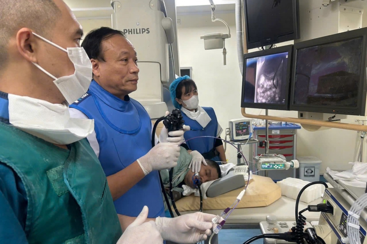 Ê kíp can thiệp đang thực hiện kỹ thuật nội soi mật tụy ngược dòng ERCP cho bệnh nhân. (Ảnh: BVCC)