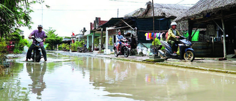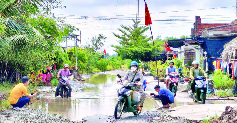 Vào những ngày mưa hoặc triều cường, nước ngập kín mặt đường, che lấp những hố sâu, biến con đường thành một cái bẫy nguy hiểm cho bất kỳ ai qua lại. Cũng vì lẽ đó, các phương tiện ô-tô, xe máy phải “bò” từng chút một vì không còn chỗ lành lặn để né nhau.