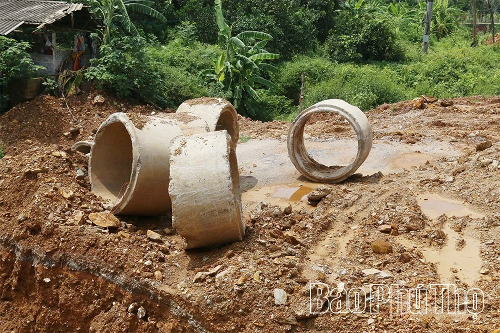 Ống cống bê tông nằm ngổn ngang bên nền đường dang dở.