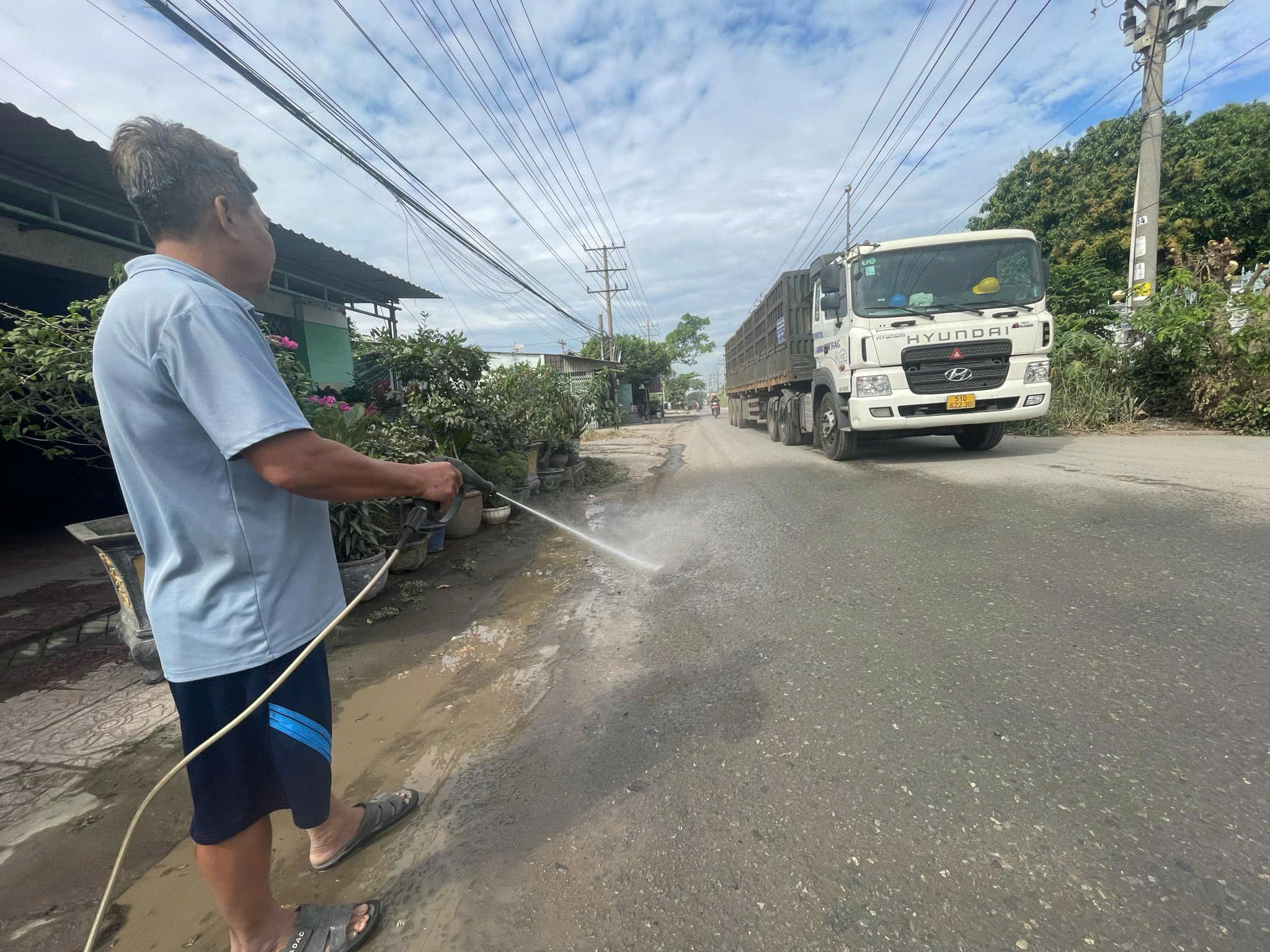 Để giảm bụi, người dân tưới nước phần đường phía trước nhà