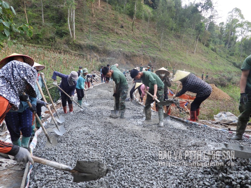 Có mặt tại công trường những ngày đầu năm mới 2026, chúng tôi ghi nhận không khí làm việc đang diễn ra khẩn trương. Tính đến thời điểm giữa tháng 1/2026, nhà thầu thi công và Nhân dân đã hoàn thành mở nền thông tuyến và cứng hóa xong 1,7/2,8 km toàn tuyến. Nhân dân các thôn đã đóng góp gần 2.000 ngày công lao động để tham gia cứng hóa tuyến đường. Trung đoàn 12, Sư đoàn 3, Quân khu 1 cũng đã thực hiện công tác dân vận khi có 40 cán bộ chiến sỹ tham gia đóng góp gần 1,5 nghìn ngày công làm tuyến đường.