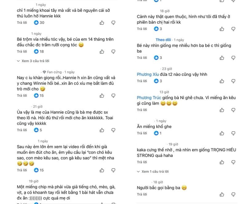 Với gương mặt bầu bĩnh và đôi mắt to tròn, cô bé lần lượt giả tiếng mèo "meo meo", tiếng chó "gâu gâu", sau đó chuyển sang tiếng gà và vịt. Màn thể hiện tự nhiên cùng biểu cảm háo hức của Hannie đã khiến nhiều người xem bật cười và bày tỏ sự yêu mến.