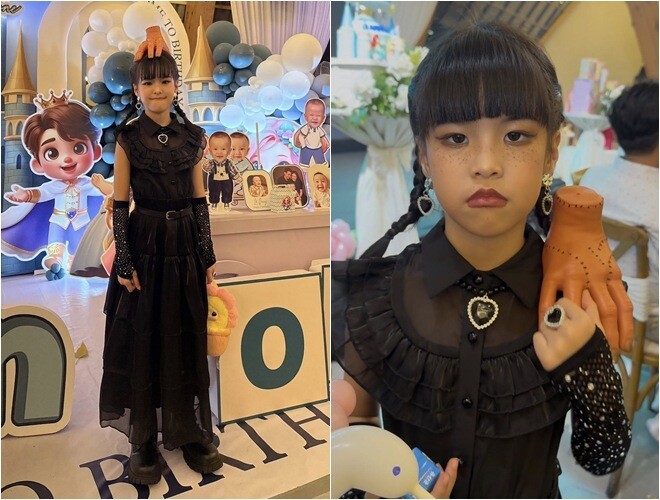 Mới đây, nữ diễn viên Gạo nếp gạo tẻ chia sẻ hình ảnh con gái trong buổi tối sinh nhật bé Lê Quang. Cô bé Bông hóa trang thành một nhân vật hoạt hình khá "rùng rợn" với bộ váy màu đen dài, đôi bốt cao cổ, bao tay đen lấp lánh và trang điểm cũng rất đậm.