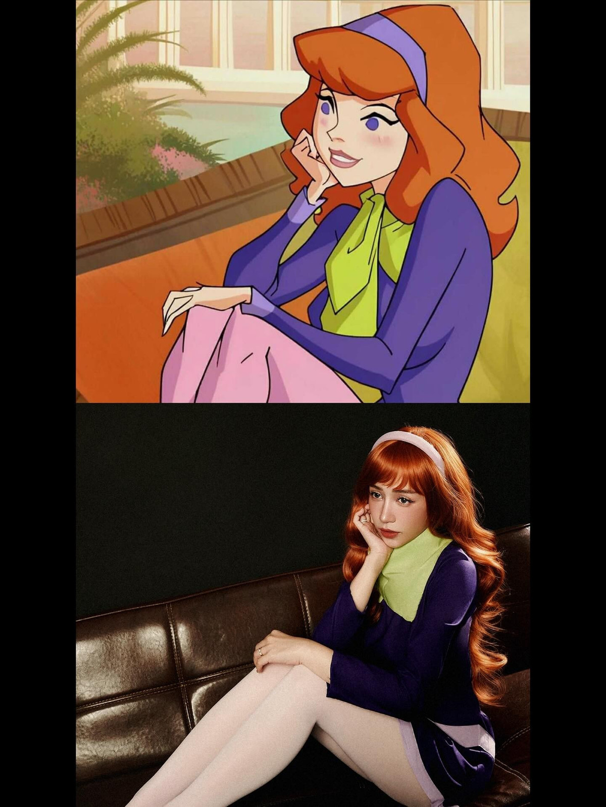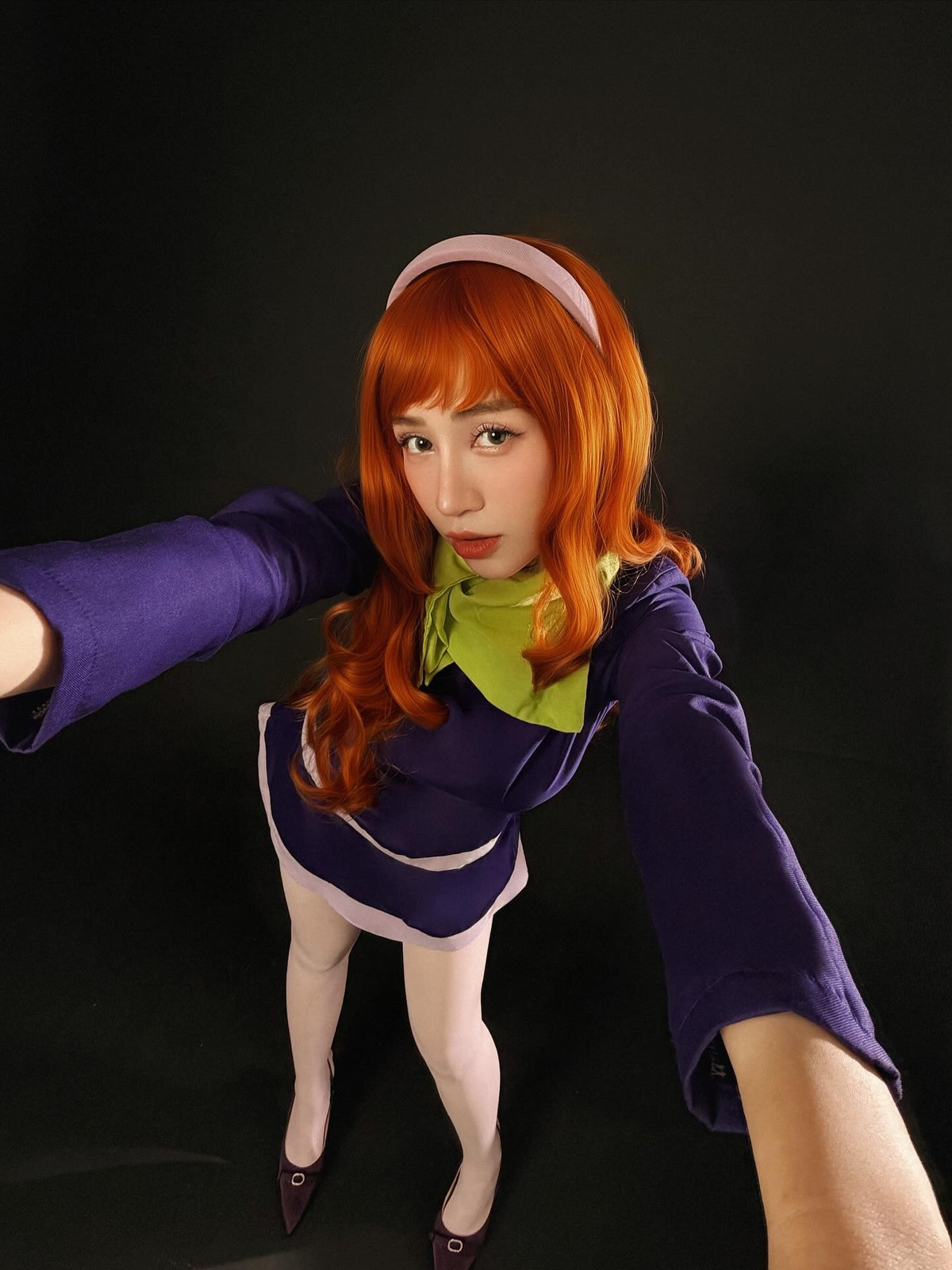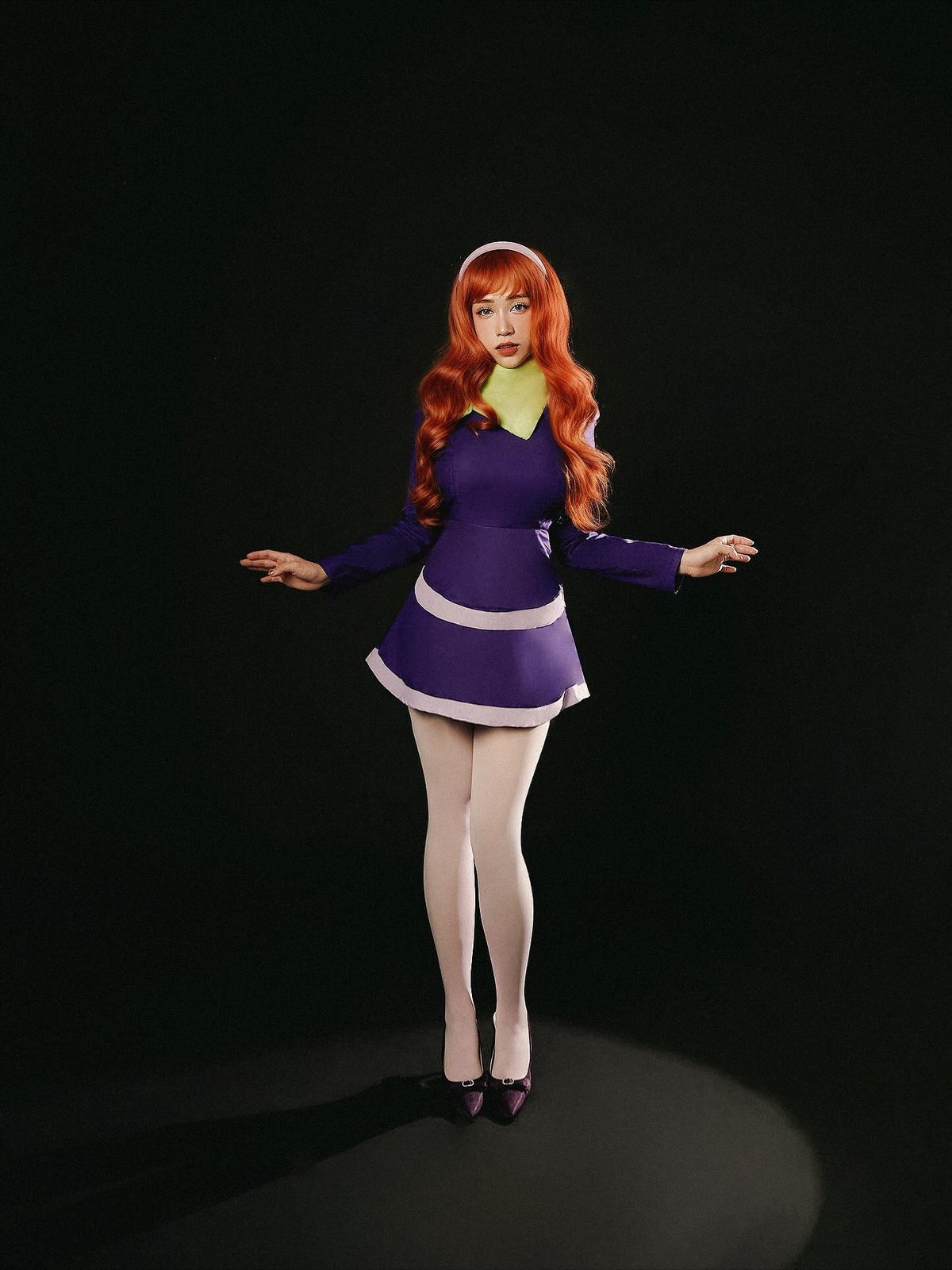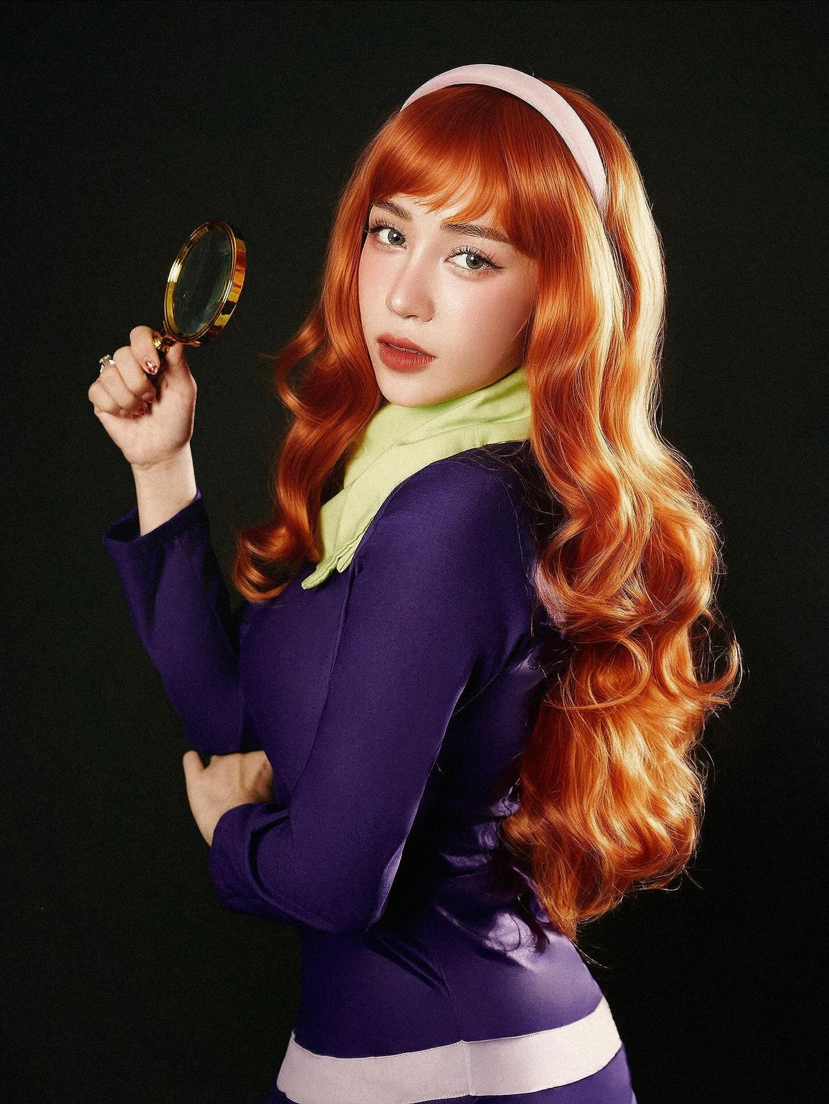 Con gái Minh Nhựa hóa thân thành cô nàng thời trang Daphne một cách hoàn hảo. Bộ váy tím đặc trưng, khăn choàng màu xanh neon, băng đô hồng, và mái tóc đỏ cam bồng bềnh được đầu tư kỹ lưỡng, đặc biệt là thần thái "người đẹp gặp nguy hiểm" nhưng không kém phần sắc sảo của cô nàng. (Ảnh: FBNV)
