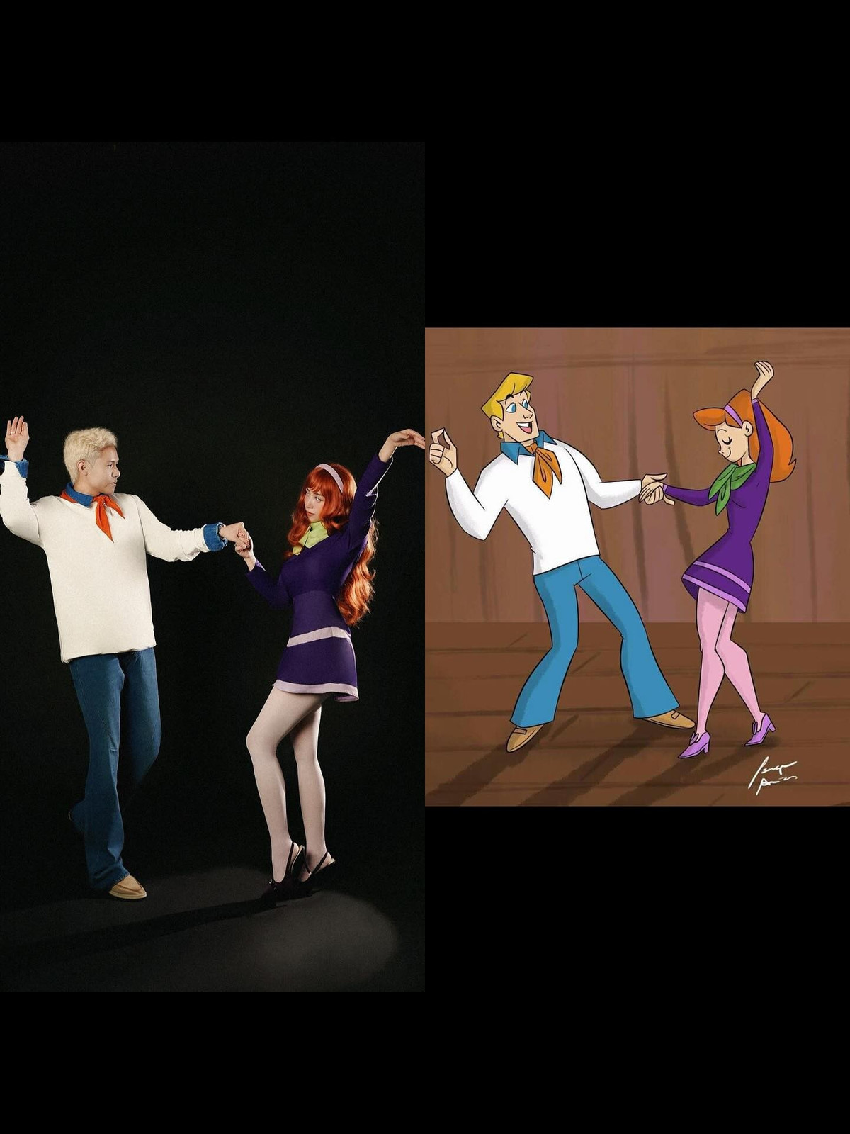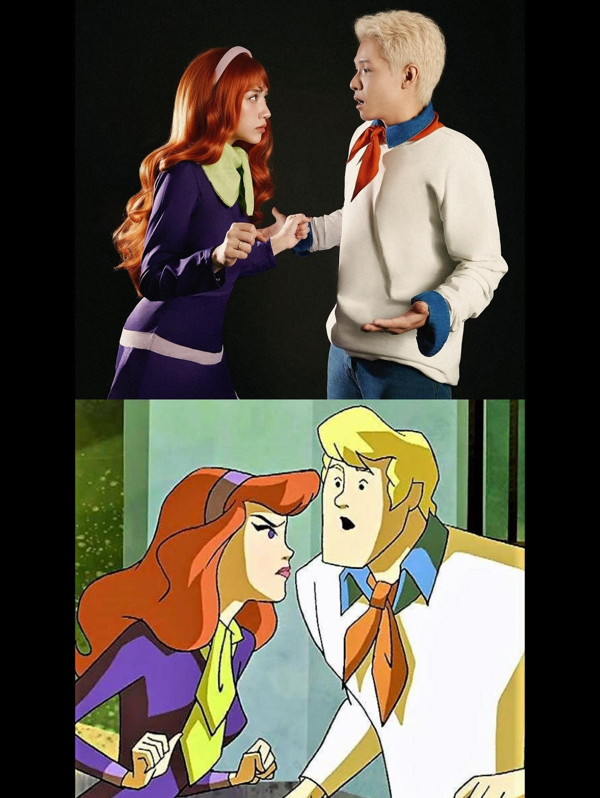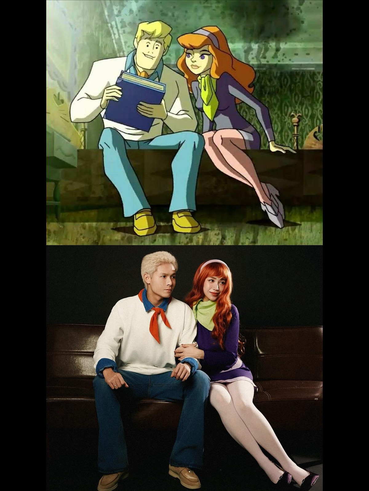 Những bức ảnh được ghép đôi với các phân cảnh nổi tiếng của Daphne và Fred, từ khoảnh khắc lãng mạn ngồi cạnh nhau đến những biểu cảm nghiêm túc khi "giải quyết bí ẩn". (Ảnh: FBNV)