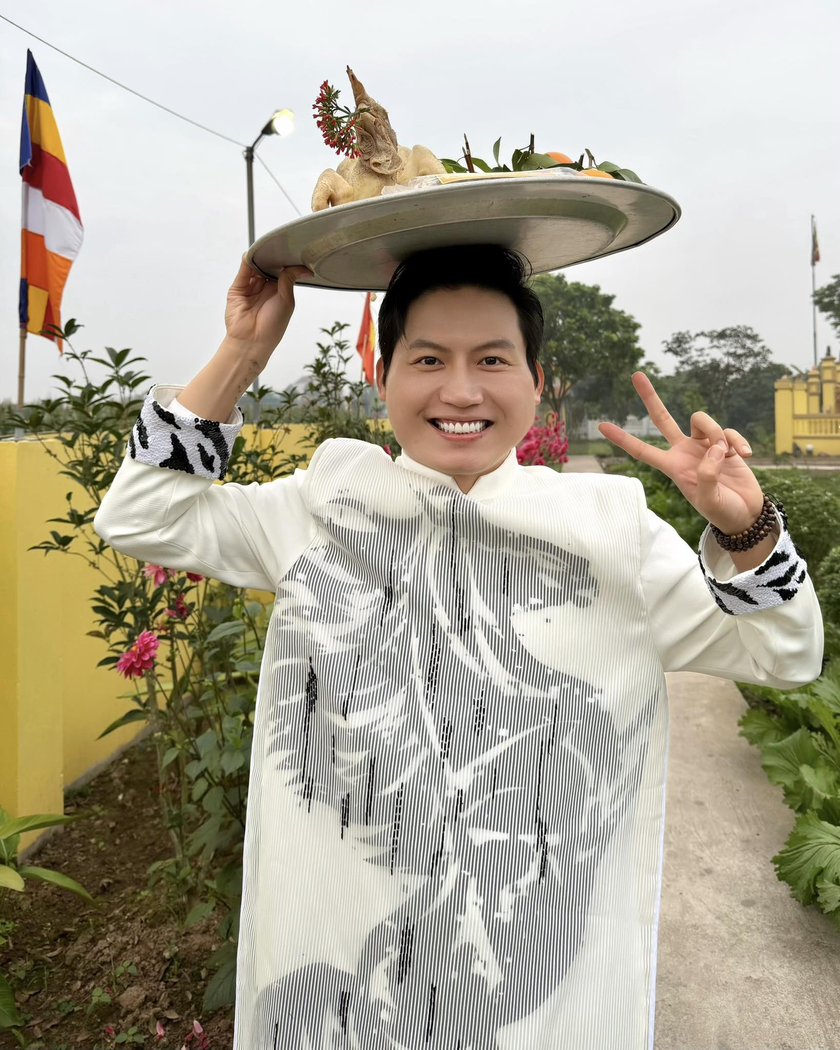 Ca sĩ Anh Tú gây cười với hình ảnh 'bẹo hình bẹo dạng' đội mâm và viết: ''Mùng Ba mặt bánh đa''.