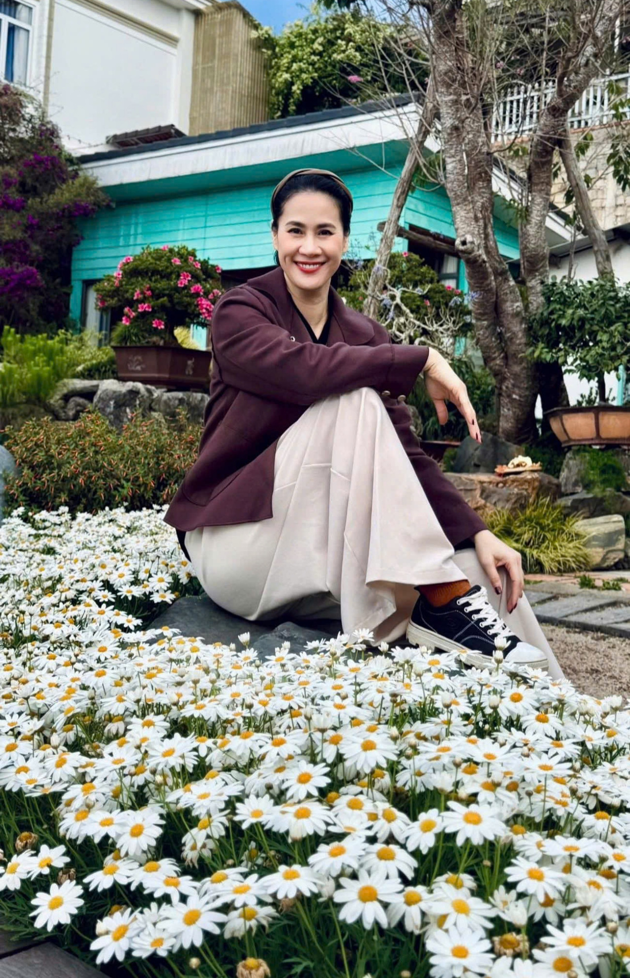 Diễn viên Thân Thúy Hà rạng rỡ bên vườn cúc họa mi.