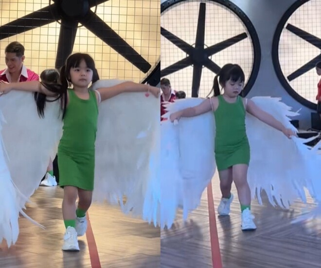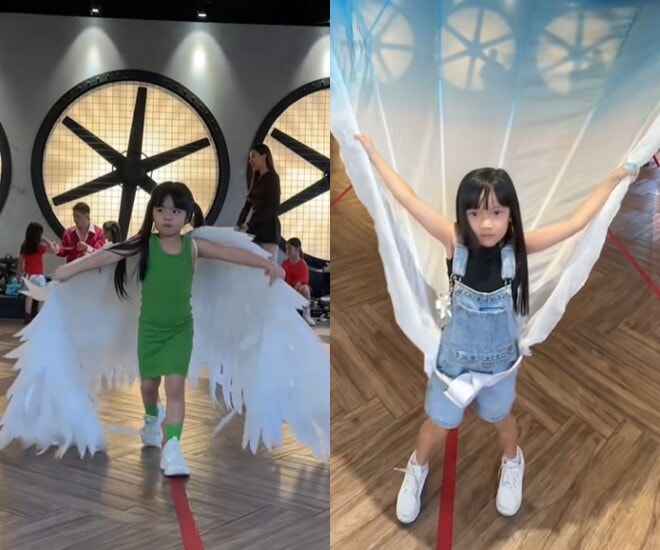 Với vai trò là "chị lớn" và đã có kinh nghiệm biểu diễn trên nhiều sân khấu thời trang từ cuối năm 2025, bé Destiny (Võ Thanh Thiên Ý) thể hiện phong thái tự tin vượt trội. Cô bé 7 tuổi khiến nhiều người trầm trồ khi thực hiện màn catwalk uyển chuyển với đôi cánh cao gần 3m.