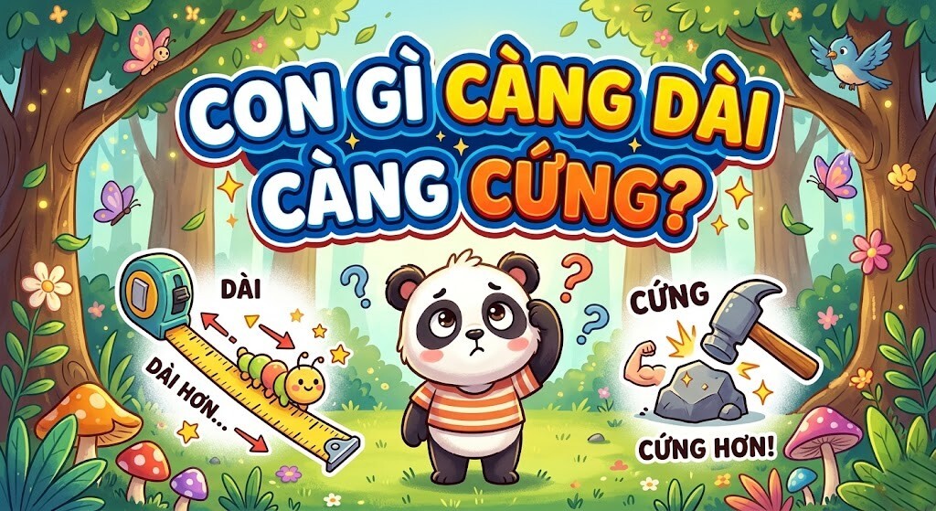 Trong hình minh họa, chú gấu trúc đang đứng giữa khu rừng với vẻ mặt bối rối trước câu hỏi: “Con gì càng dài càng cứng?”. Các chi tiết xung quanh như chiếc thước đo kéo dài hay hình ảnh chiếc búa đập vào hòn đá càng khiến người xem dễ liên tưởng đến những vật thể cụ thể, từ đó suy luận theo hướng “độ dài” và “độ cứng” theo nghĩa vật lý.