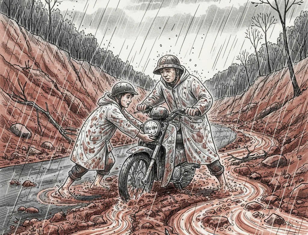 Cái khó ló cái khôn, thầy Long dựng chân chống xe xuống, lợi dụng dòng nước đang chảy mạnh trên mặt đường hai thầy trò bắt đầu khua chân và bẻ cành cây làm như cái chổi khua, quét cho đất tan ra chảy theo dòng nước. Sau một hồi nỗ lực đám đất cũng tan ra và chảy đi, hai bánh xe máy đã được giải cứu, dắt xe qua vũng lầy hai thầy trò lại tiếp tục đi tiếp. Thế rồi cũng hết đoạn đường liên xã rẽ vào Lũng Chuối nhà Khải. Đoạn đường đất bé chỉ đủ cho xe máy và máy cày đi trở nên trơn trượt, hai bên sườn đồi trồng toàn chuối, những lá chuối bị gió xé xác xơ, những cây mang buồng nặng nề đã gẫy gục xuống, có cây lại bật gốc nằm ngổn ngang. Thầy Long lạ đường, có nhiều đoạn hai thầy trò thót tim vì xe trượt theo dốc. Khải không dám ngồi trên xe nữa, cậu ta xuống hộ thầy lúc đẩy lúc kéo lại. Thấy đường khó quá Khải bảo với thầy qua đoạn đường hẹp này đến đầu cầu bắc qua con suối đường rộng hơn thầy quay xe lại về trường còn Khải đi bộ về nhà. Trời đã sẩm tối, hai thầy trò cũng đã đến con suối. Thầy Long đưa mắt nhìn con suối, dòng nước ngầu đỏ cuồn cuộn chảy, nước từ trên đồi, trên đường vẫn đổ xuống suối cuốn phăng cả những cành củi khô nổi lềnh bềnh trên mặt nước, thầy nhìn quanh chẳng thấy cây cầu đâu cả, thầy hỏi Khải: