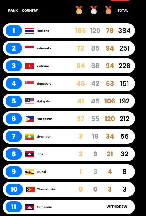 Thành tích ấn tượng này đã nâng tổng số huy chương vàng của đoàn lên con số 64, củng cố vững chắc vị trí thứ ba trên bảng tổng sắp huy chương, kiên trì bám đuổi hai đoàn dẫn đầu là Thái Lan với 182 huy chương vàng và Indonesia với 72 huy chương vàng.