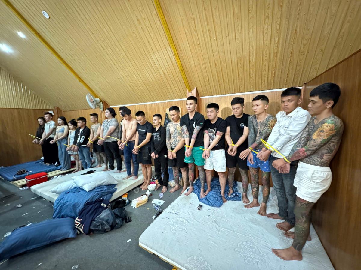 Tại hiện trường, lực lượng Công an thu giữ nhiều viên nén màu hồng và viên nén màu vàng, chất tinh thể trắng (nghi là ma túy) cùng nhiều dụng cụ phục vụ việc sử dụng ma túy. Đối tượng N.V.Đ khai nhận số viên nén trên là ma túy do mình mang theo để sử dụng cùng bạn bè trong tiệc sinh nhật. Qua test nhanh, Công an xác định 28 đối tượng dương tính với các chất ma túy. Hiện cơ quan Công an đang tạm giữ các đối tượng liên quan để điều tra, xử lý theo quy định của pháp luật.