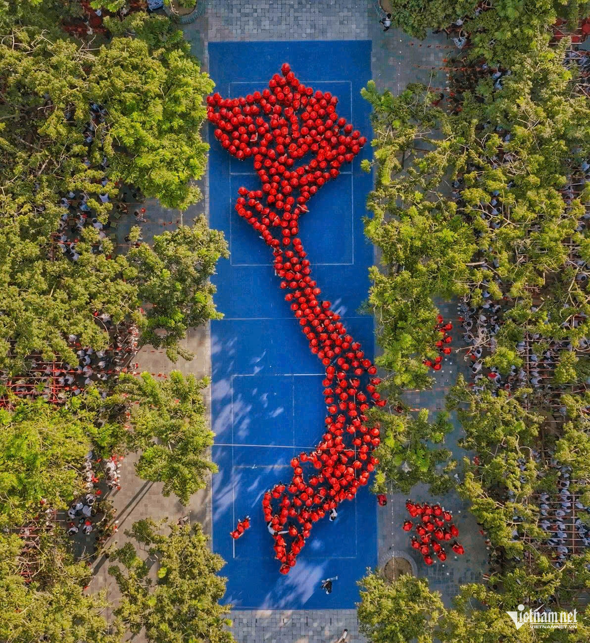 425 học sinh khối 6 Lương Thế Vinh trong sắc áo cờ đỏ sao vàng xếp hình Tổ quốc - biểu tượng của tình yêu nước được ươm mầm từ những bước chân đầu cấp. Ảnh: Hoàng Hà