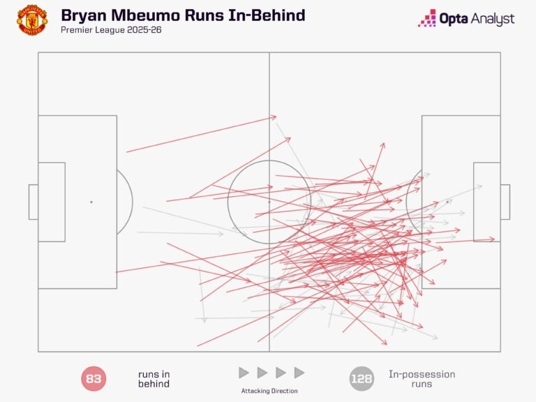 Thống kê những pha chạy chỗ sau lưng hàng phòng ngự đối thủ của Mbeumo mùa này. Ảnh: Opta.