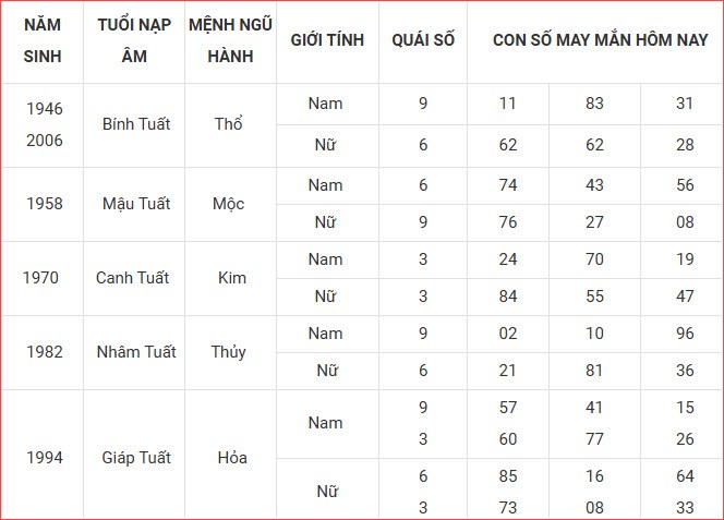 Con số may mắn hôm nay tuổi Tuất: Tuổi Tuất hôm nay nếu tiếp tục duy trì sự kiên trì và trách nhiệm sẽ dễ gặt hái kết quả tốt — đừng để thất vọng nhỏ làm bạn nản lòng.