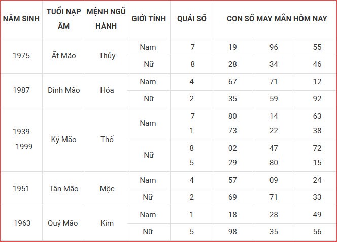 Con số may mắn hôm nay tuổi Mão: Tuổi Mão hôm nay nên kiềm chế cảm xúc và lời nói nhạy cảm – sự ôn hòa sẽ giúp bạn giữ hòa khí trong gia đình và nơi làm việc.