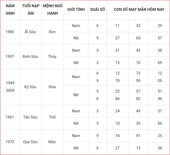 Con số may mắn hôm nay tuổi Sửu: Tuổi Sửu có cơ hội thuận lợi về tài lộc nếu biết tận dụng các công việc phụ – đừng chi tiêu vội vàng.