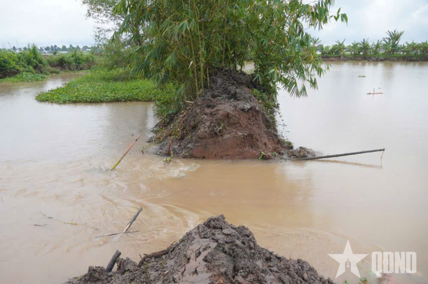 Đoạn đê bao bị vỡ do triều cường dâng cao vượt mốc lịch sử.