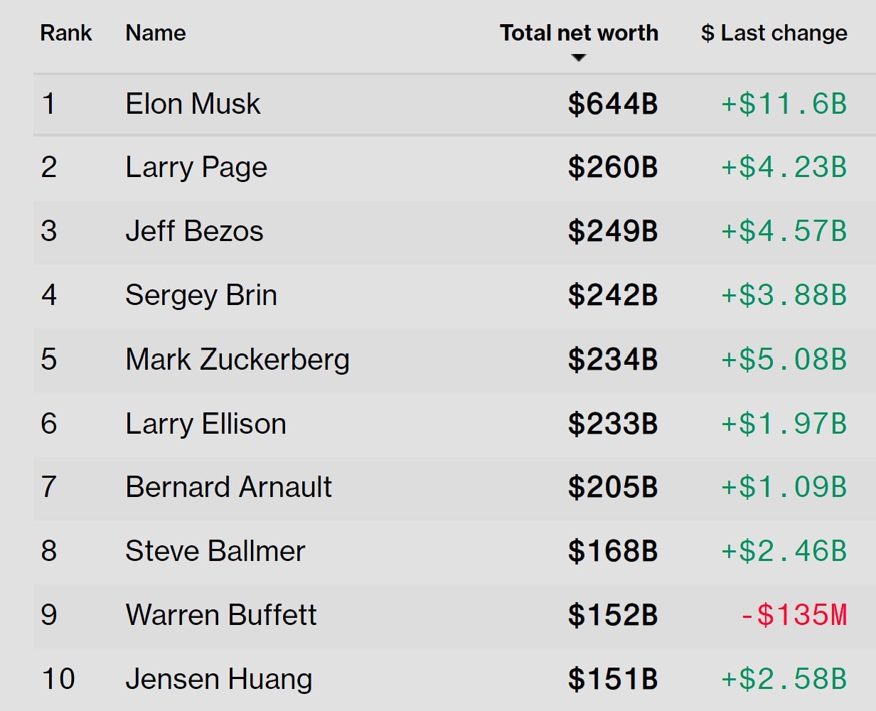 Elon Musk hiện vẫn là tỷ phú giàu nhất thế giới với tài sản ròng 644 tỉ USD. Hôm 15.12 vừa qua, Giám đốc điều hành Tesla và SpaceX trở thành người đầu tiên trên thế giới có 600 tỉ USD, sau khi tài sản tăng thêm 167 tỉ USD chỉ trong một phiên. Nguyên nhân giúp tài sản tỷ phú 54 tuổi người Mỹ tăng vọt do hãng hàng không vũ trụ SpaceX chuẩn bị IPO năm tới và sắp thực hiện đợt bán cổ phần định giá công ty ở mức 800 tỉ USD. Elon Musk hiện nắm 42% cổ phần SpaceX.