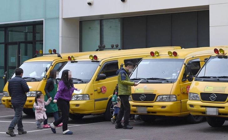 Nnhững chiếc xe buýt chờ đón các em nhỏ tại một học viện tiếng Anh, được gọi là "trường mẫu giáo tiếng Anh", ở quận Gangnam, phía nam Seoul. Ảnh: Korea Times