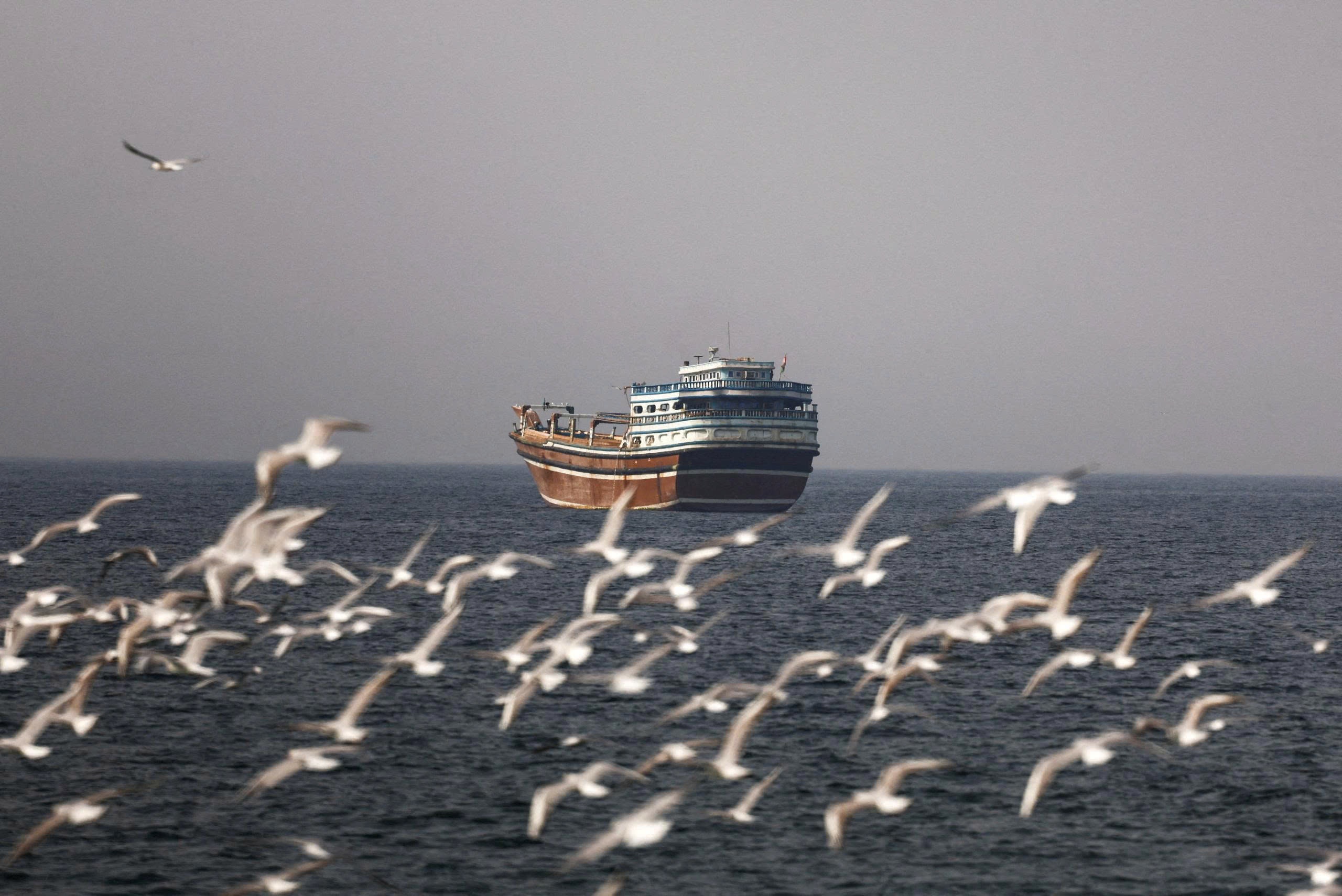 Những con chim bay gần một con tàu neo gần eo biển Hormuz ngày 2/3. Ảnh: Reuters.