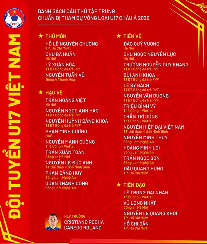 Trong kế hoạch hướng tới vòng loại U17 châu Á 2026, HLV Cristiano Roland vừa công bố danh sách tập trung gồm 30 cầu thủ. Đội tuyển U17 Việt Nam sẽ hội quân ngày 5-10 tại Hà Nội, với nòng cốt là những gương mặt từng dự giải quốc tế CFA Team China 2025. Nổi bật trong số này có tiền đạo Nguyễn Văn Dương - Vua phá lưới, Cầu thủ xuất sắc nhất U15 quốc gia 2024 và tiền vệ Chu Ngọc Nguyễn Lực, thủ lĩnh hàng tiền vệ tại VCK U17 châu Á 2025.