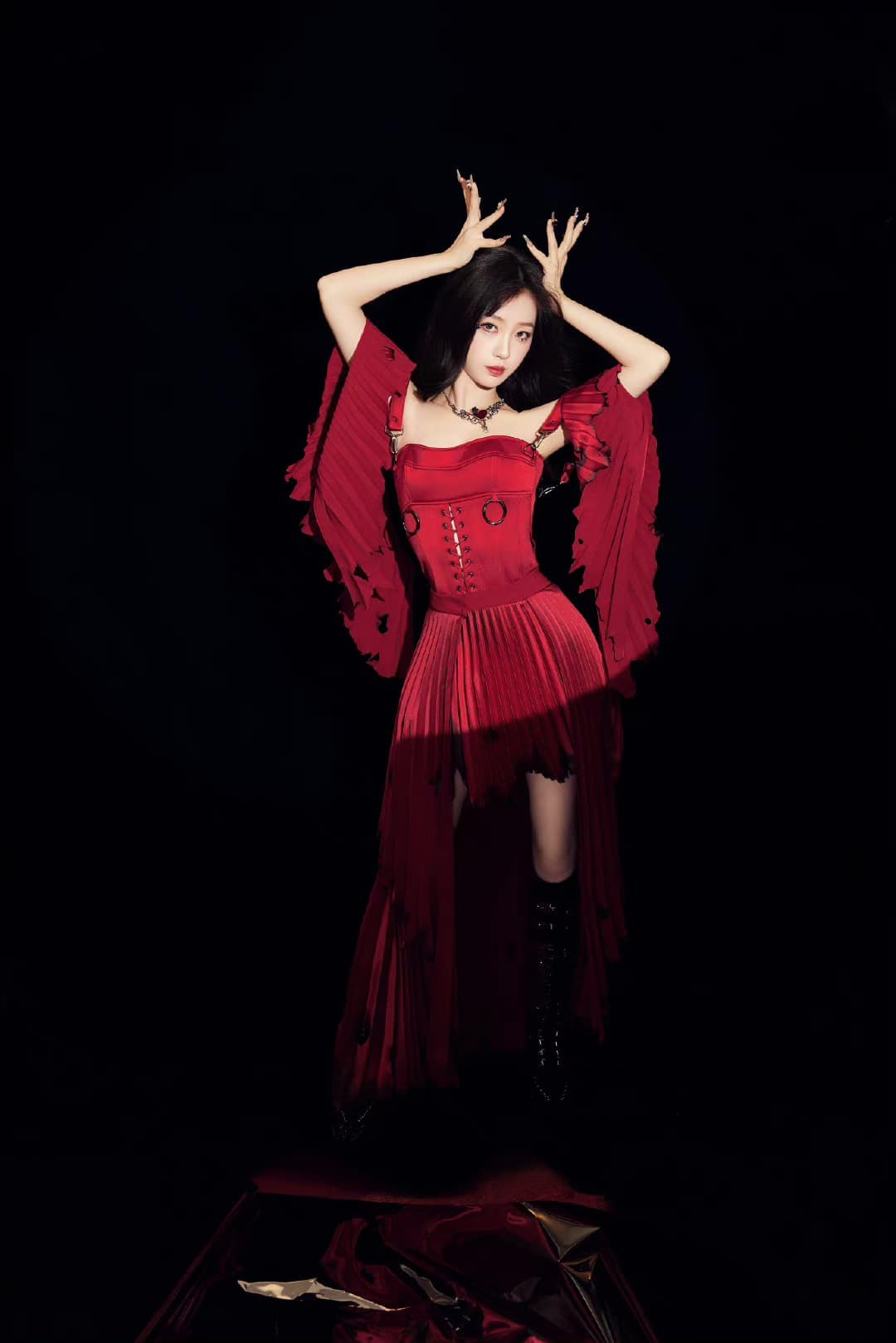 Bộ trang phục của sao nữ Trung Quốc cũng lấy gam đỏ chủ đạo với thiết kế dáng corset và phần váy xếp ly có hiệu ứng cháy xém. Cả hai mỹ nữ Hàn, Trung đều kết hợp trang phục cùng bốt chiến binh cao cổ, mang tới tinh thần mạnh mẽ.