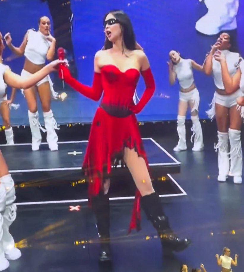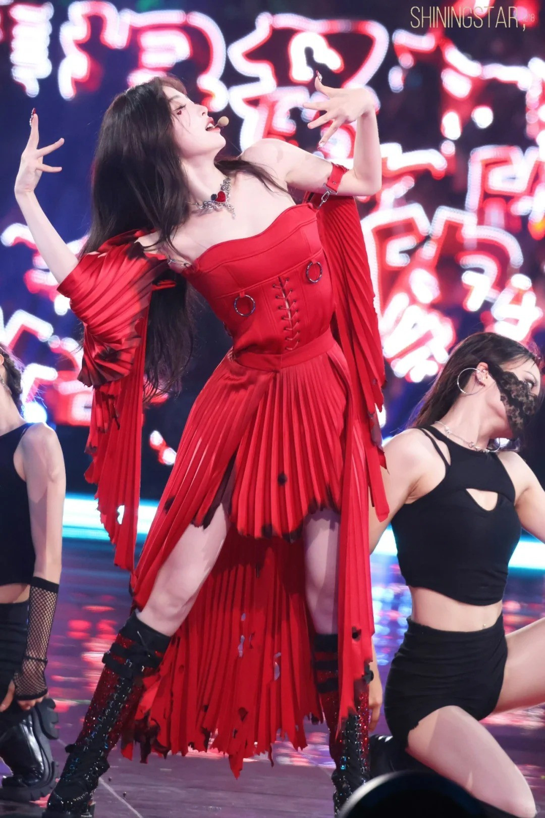 Ngu Thư Hân mặc thiết kế liền mảnh có phần tay rời xòe rộng, tạo hiệu ứng thị giác mạnh mẽ khi thực hiện vũ đạo. Trong khi đó, Jennie diện thiết kế gồm áo corset ombre và chân váy, phối cùng găng tay đỏ bó sát thay vì tay áo rủ.