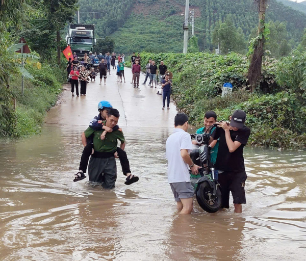 Công an xã Đèo Gia hỗ trợ sơ tán người dân đến nơi an toàn.