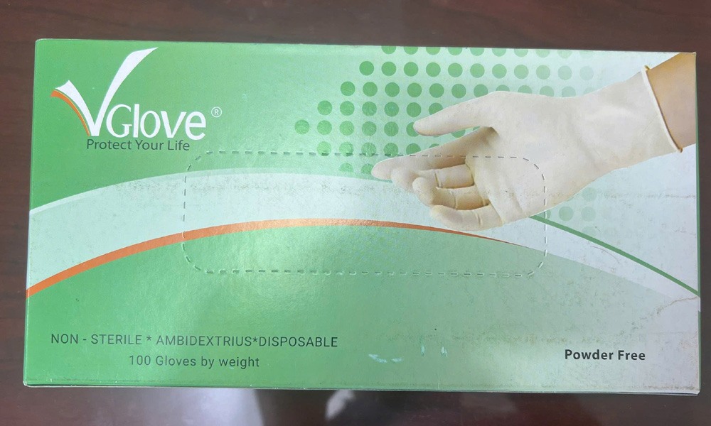 Sản phẩm hộp găng tay hoàn chỉnh trên vỏ hộp có nội dung “Găng tay cao su y tế Vgloves; VPGKHAIHOAN JOINT STOCK COMPANY, địa chỉ thể hiện: Cau den Hamlet, Lac Hung Commune, Bai Bang Dist, Binh Duong Provice, Viet Nam; Tel: +84397199238; Email: info@vpgkhaihoan-gloves.com; Website: www.vgloves.com; Made in Vietnam”.