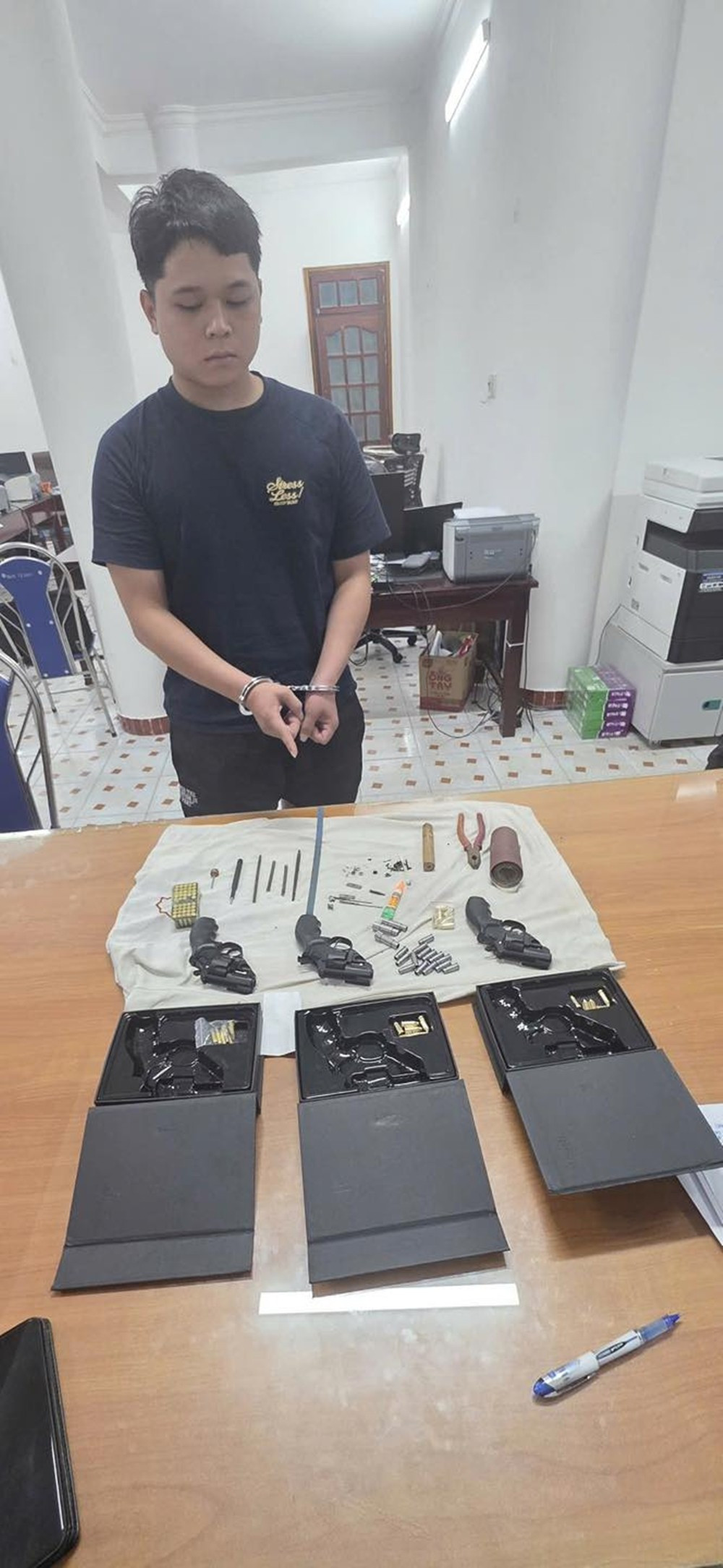 Ngày 6/10/2025, tổ công tác Phòng Cảnh sát hình sự phối hợp Phòng Kỹ thuật nghiệp vụ tiến hành kiểm tra, bắt quả tang Nguyễn Xuân Tùng đang vận chuyển 03 khẩu súng ngắn bằng kim loại, hơn 50 viên đạn và nhiều trang thiết bị liên quan đến việc chế tạo súng để đi tiêu thụ.