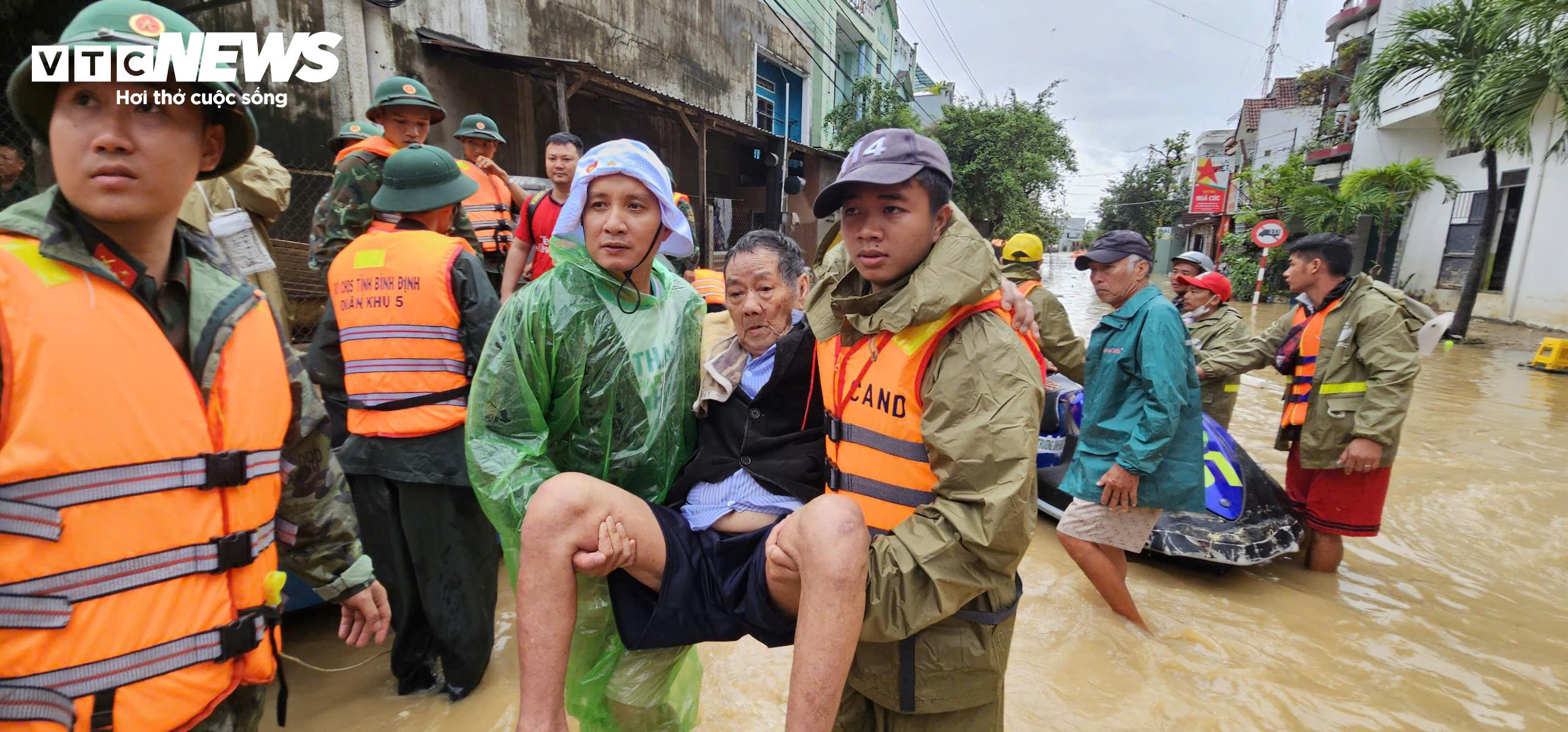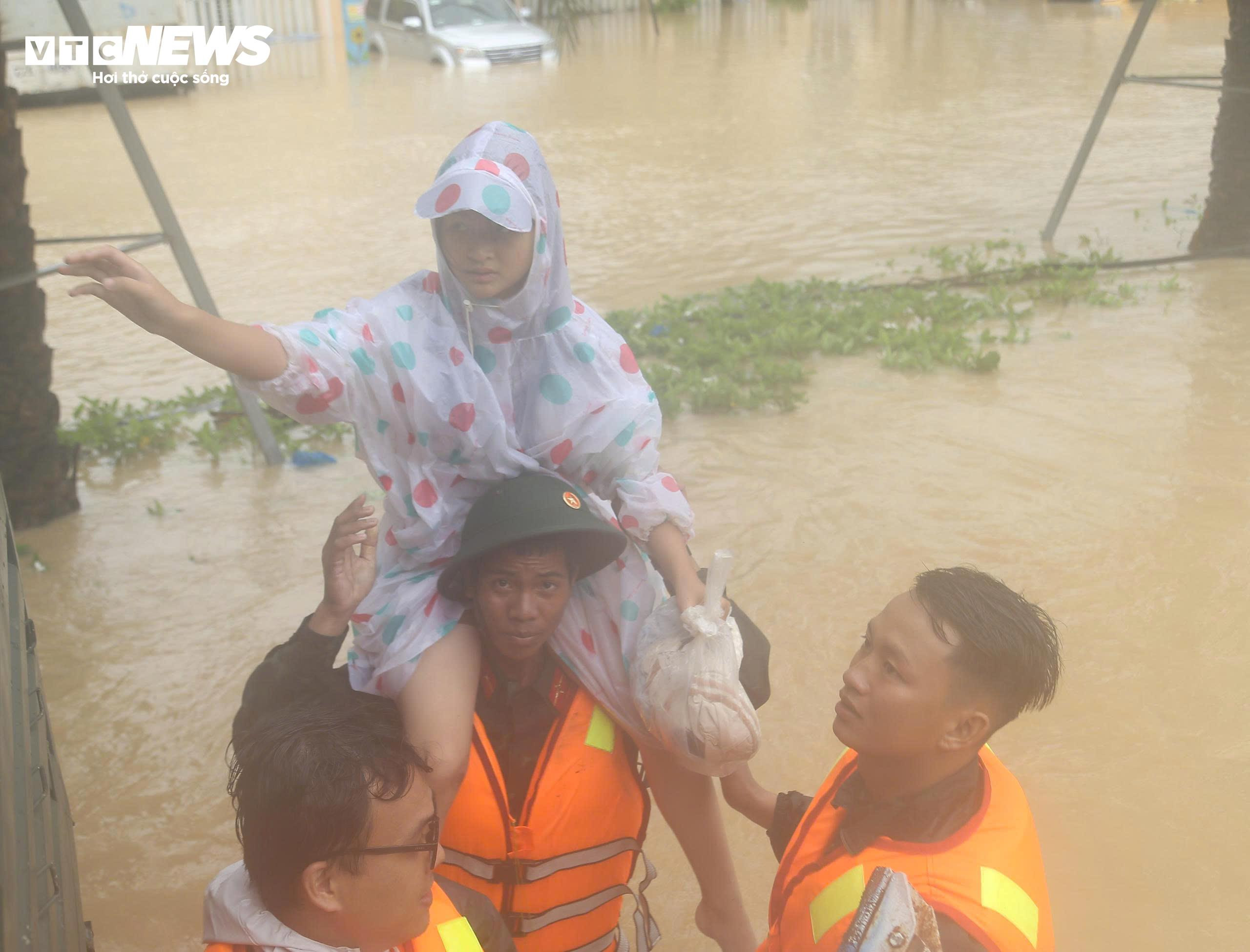Công an, bộ đội dầm mưa cõng trẻ nhỏ sơ tán.