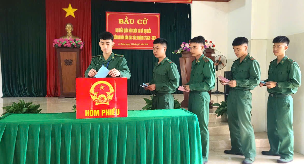 Cùng ngày, các cử tri Đồn Biên phòng Cửa khẩu Đắk Ruê ở xã Ea Bung, tỉnh Đắk Lắk đã tham gia bỏ phiếu bầu cử sớm.
