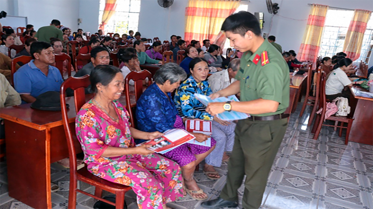 Cán bộ Phòng An ninh điều tra Công an tỉnh Cà Mau tuyên truyền pháp luật khai thác thủy sản nâng cao ý thức chấp hành của ngư dân. Ảnh: CACM