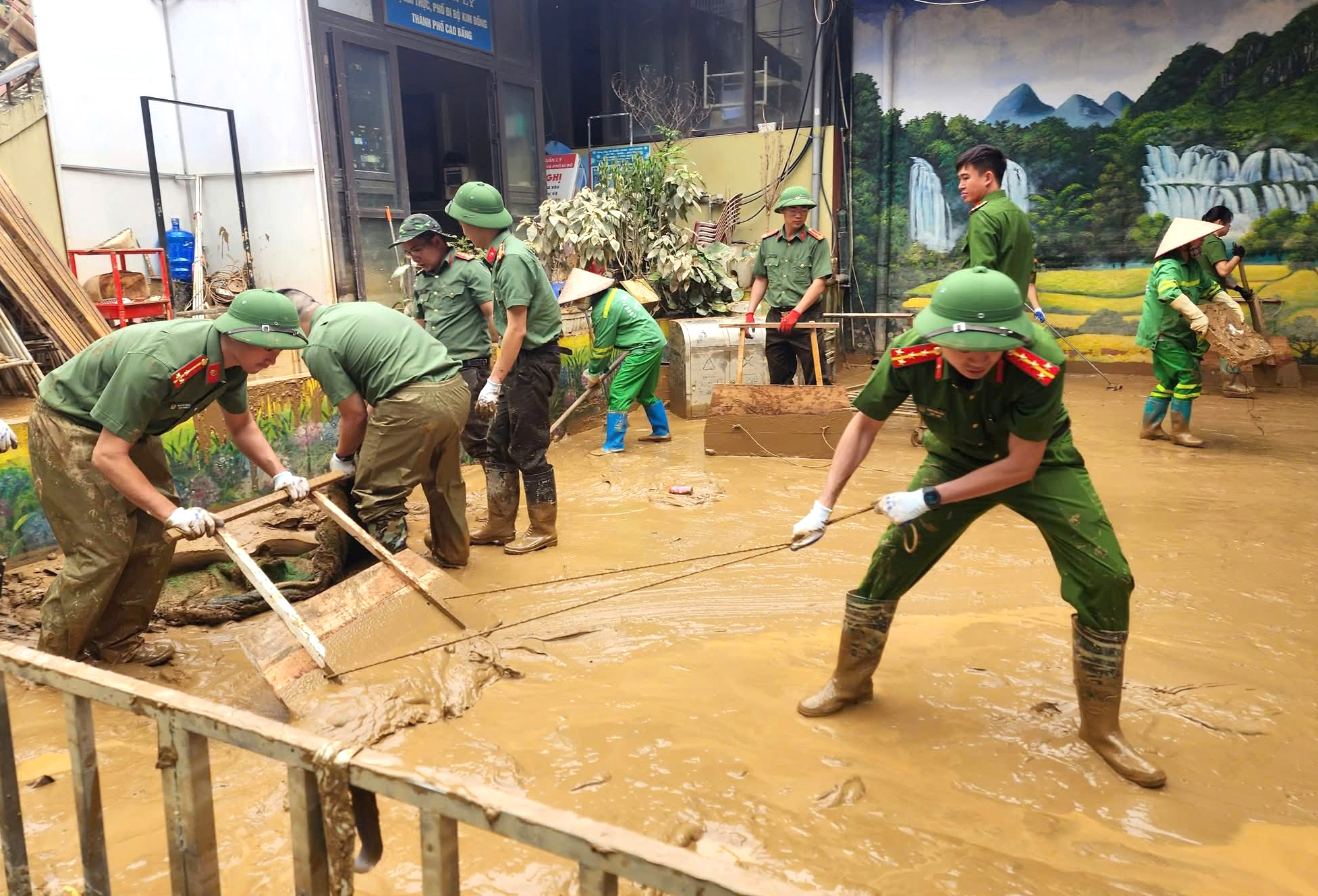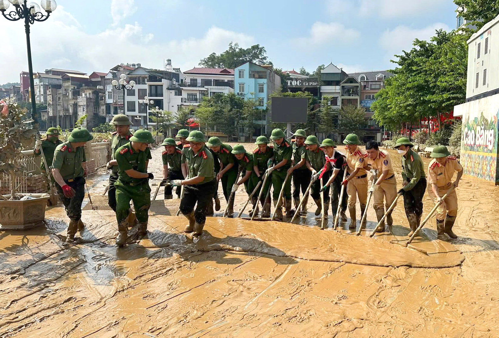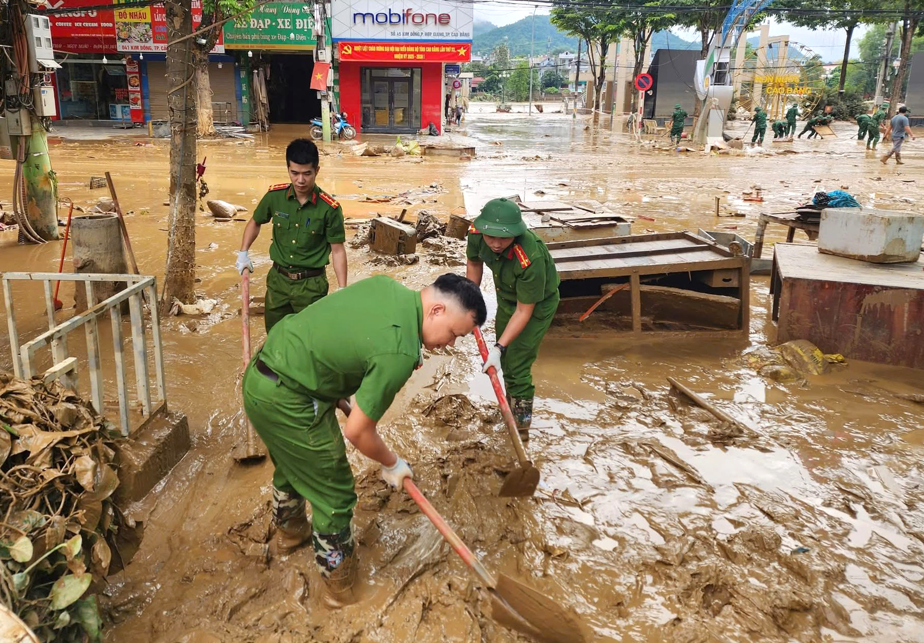 Lực lượng Công an tỉnh Cao Bằng tham gia dọn bùn đất sau khi nước đã rút ở phường Thục Phán