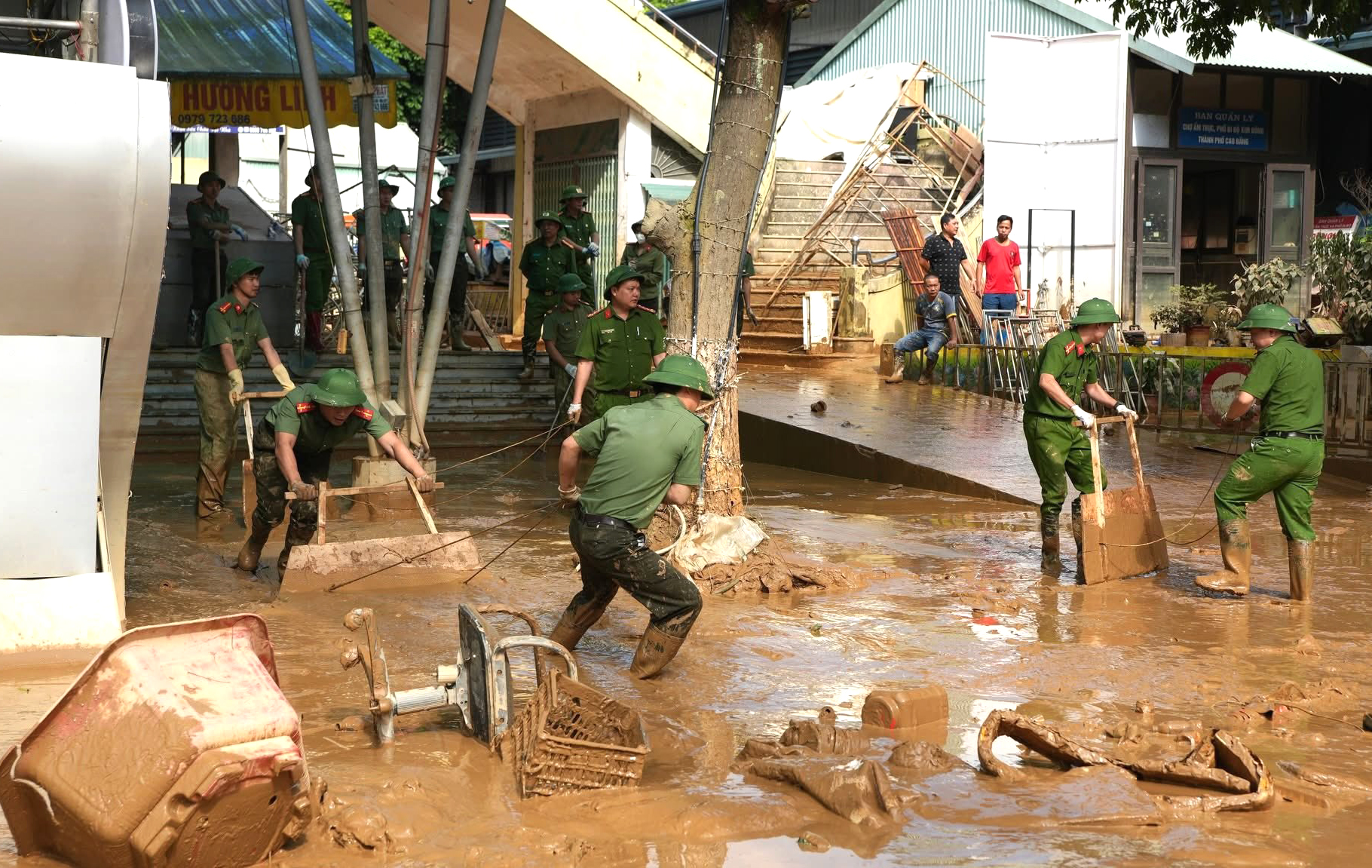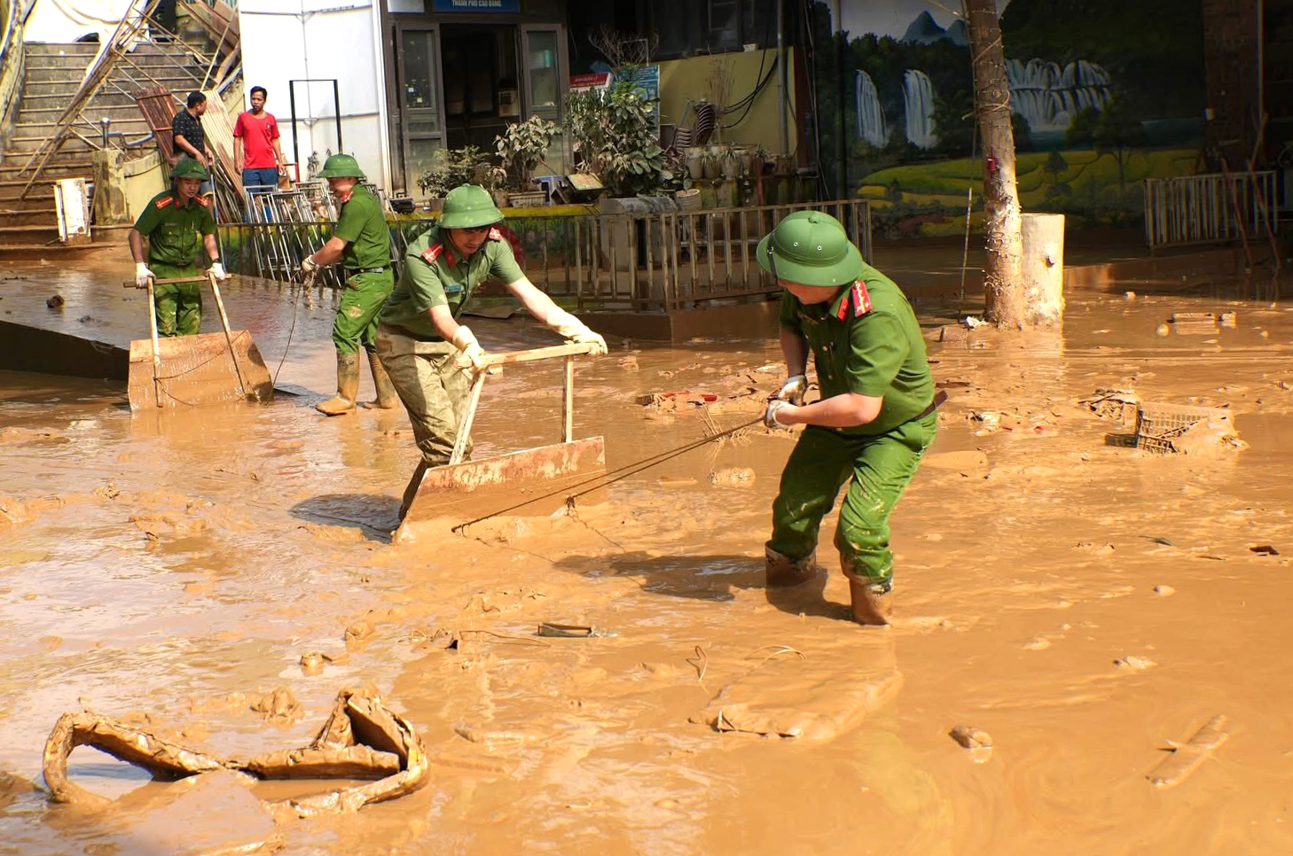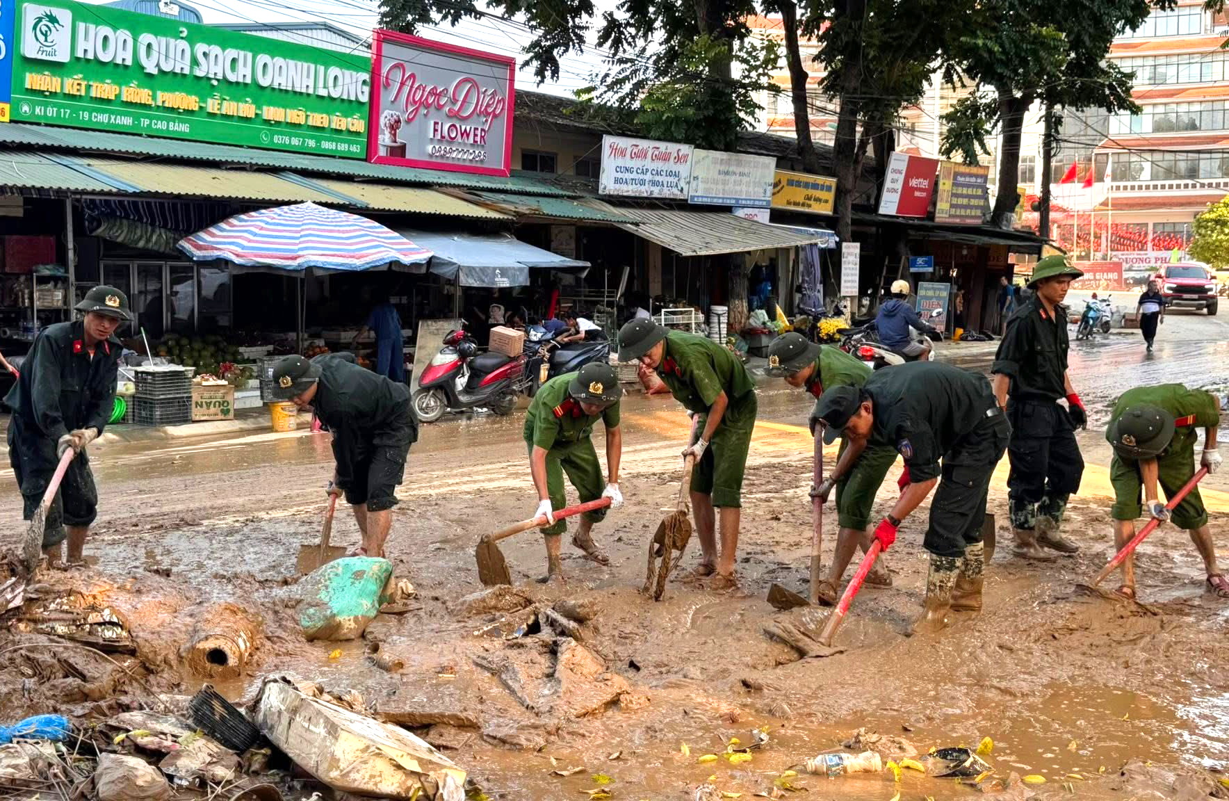 Lực lượng Công an tỉnh Cao Bằng tham gia dọn bùn đất sau khi nước đã rút ở phường Thục Phán