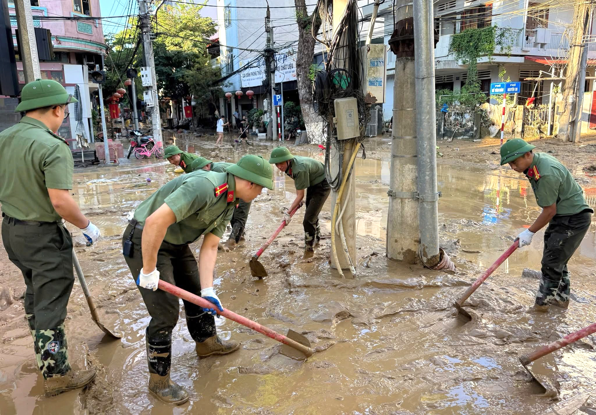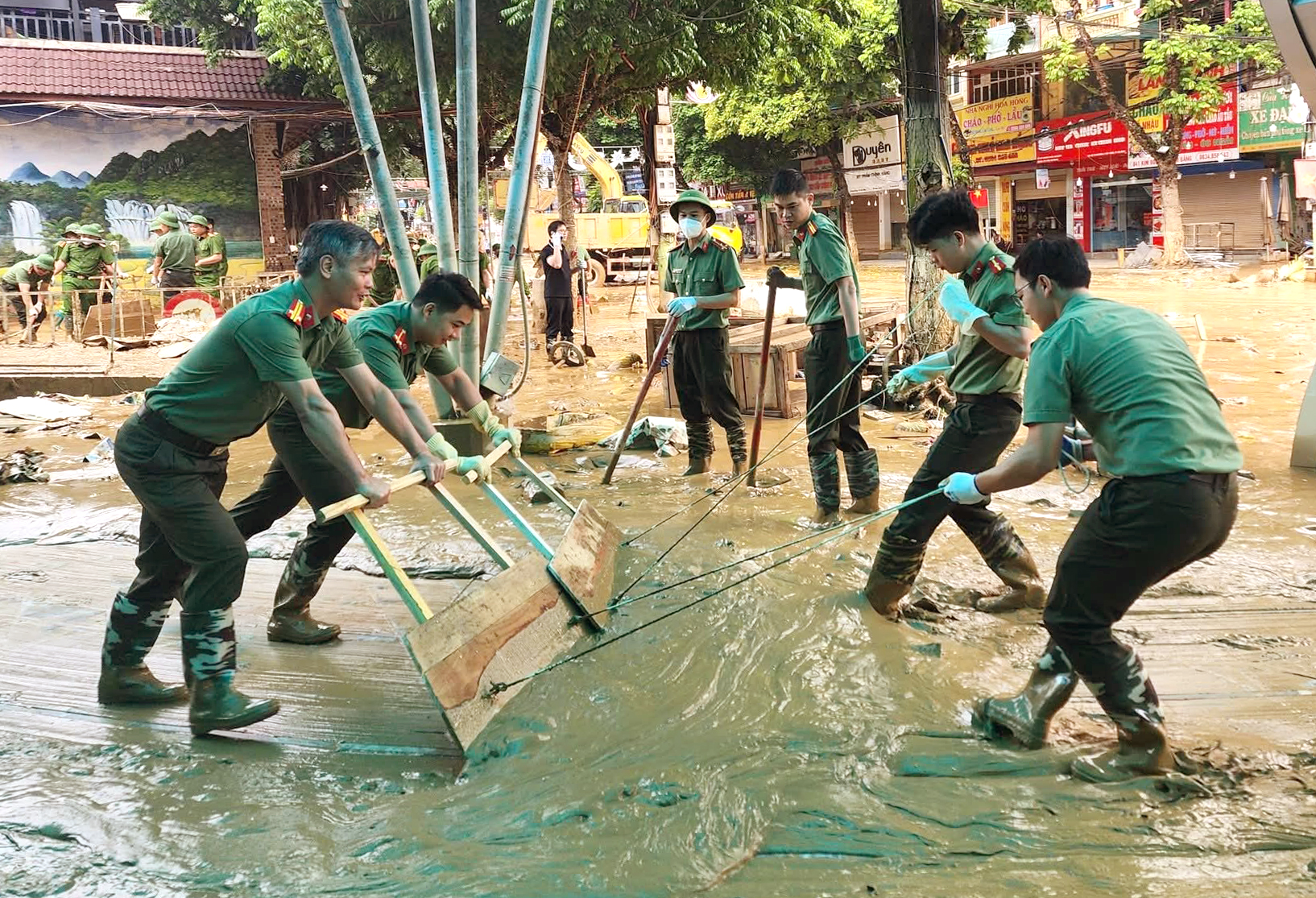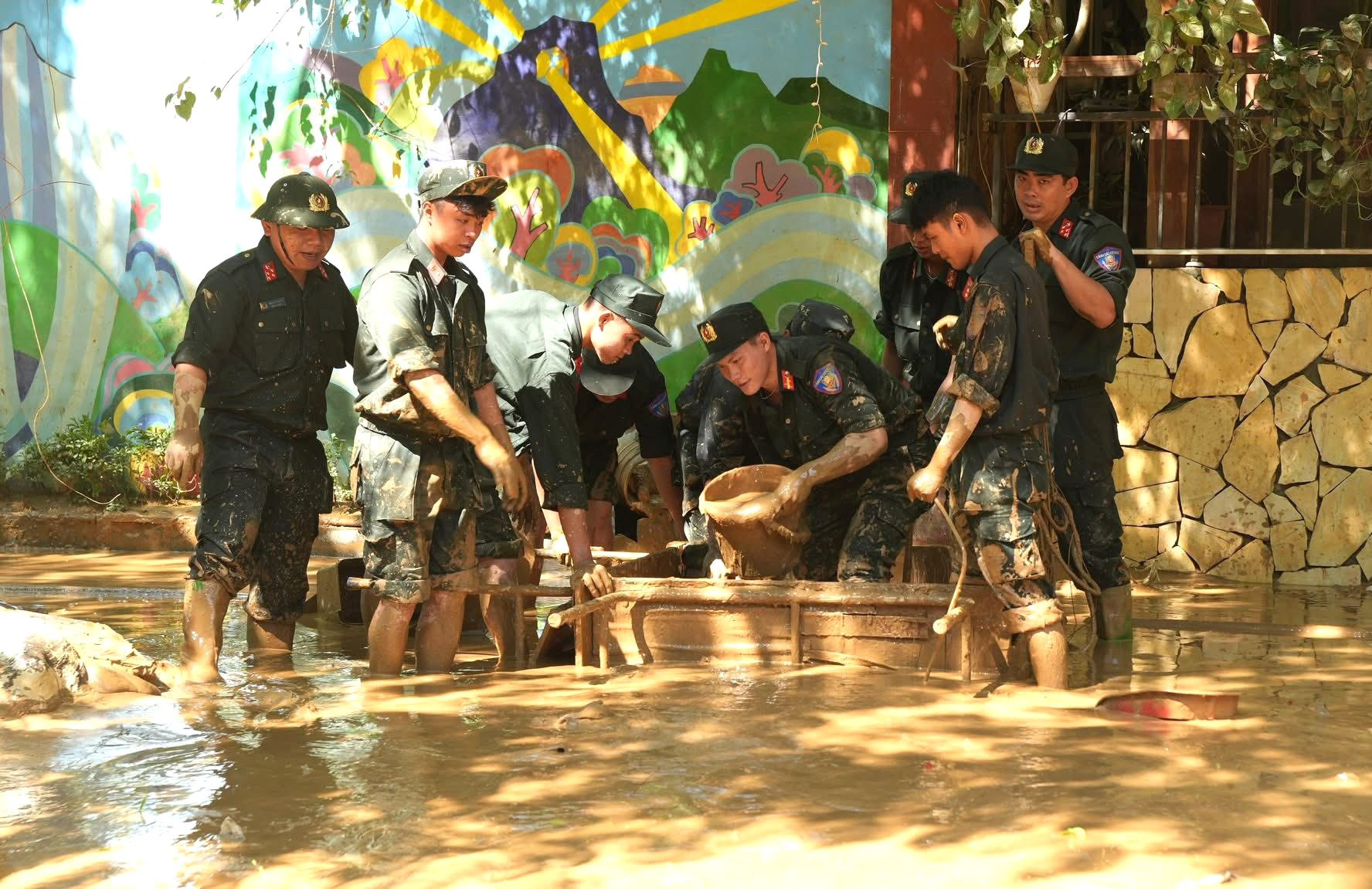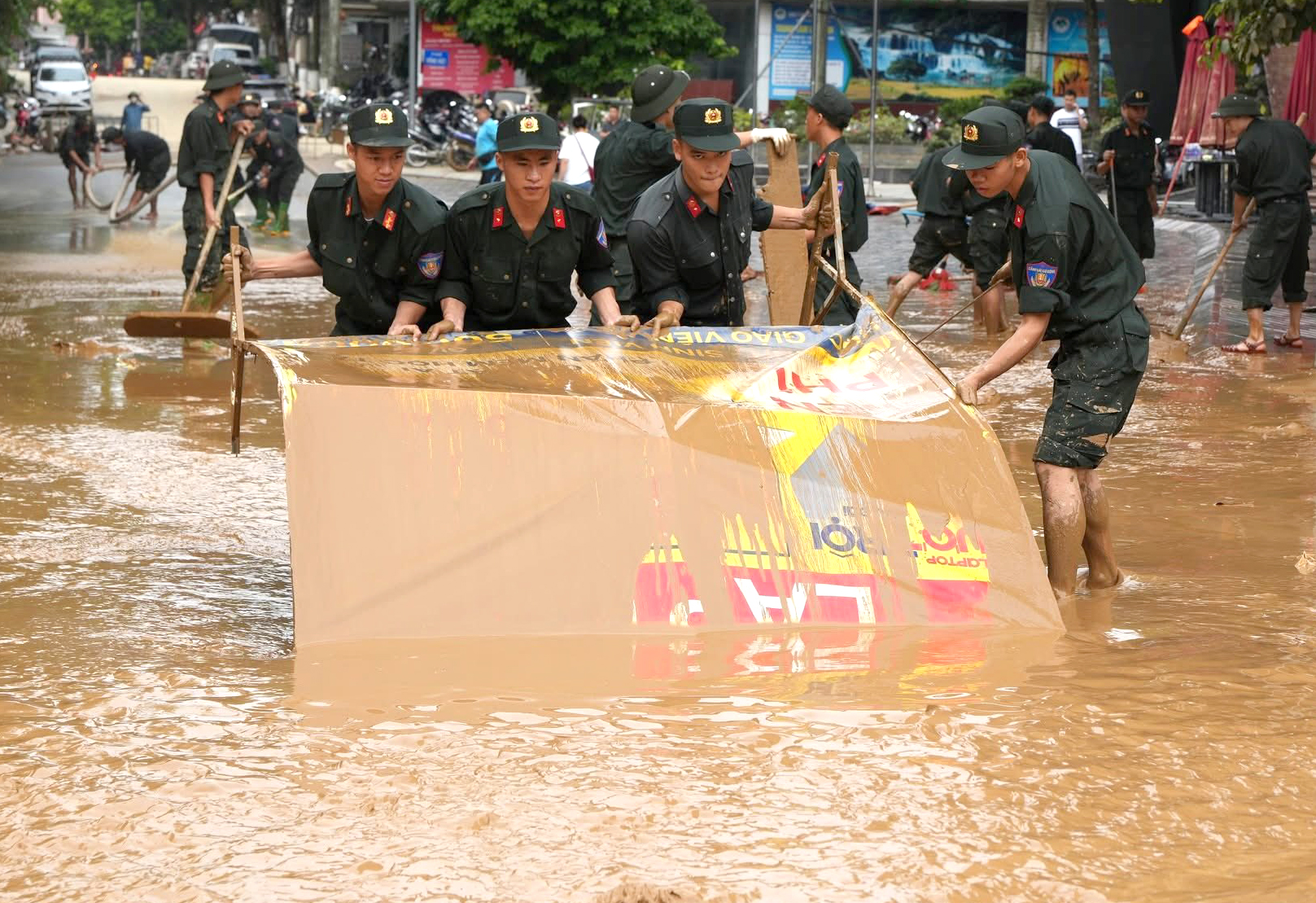 Mặc dù công việc nặng nhọc, bùn lầy ngập tới đầu gối, nhưng các chiến sĩ vẫn miệt mài làm việc, vận chuyển rác thải, khơi thông cống rãnh, nạo vét bùn để trả lại đường phố thông thoáng, sạch sẽ