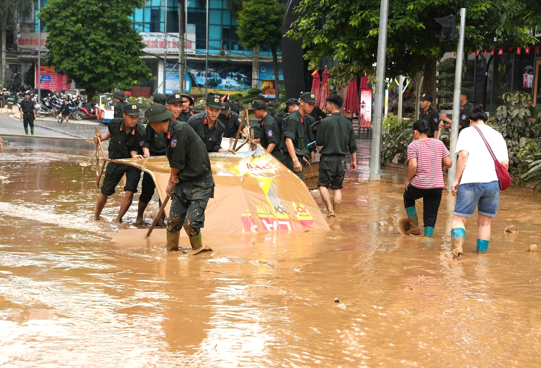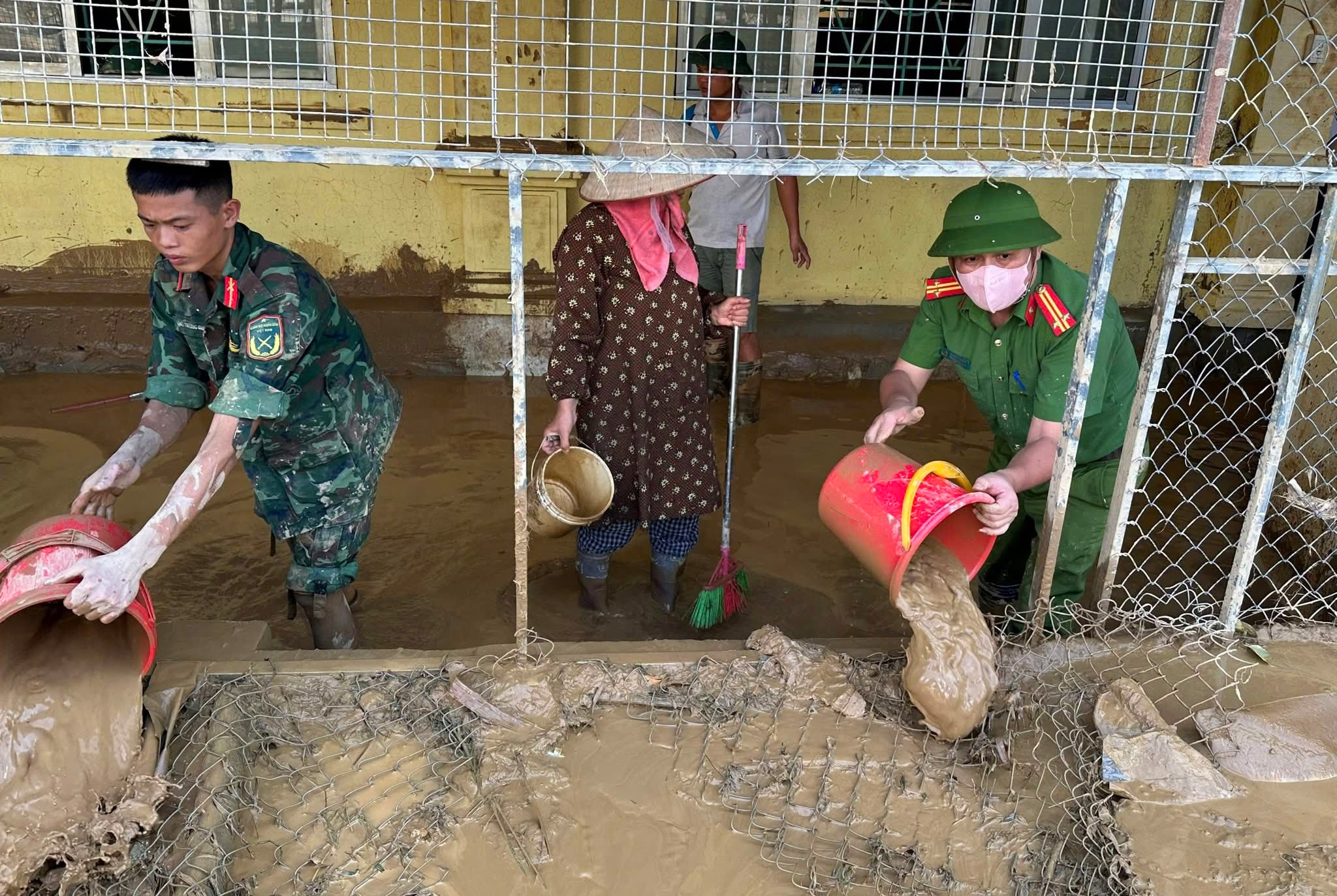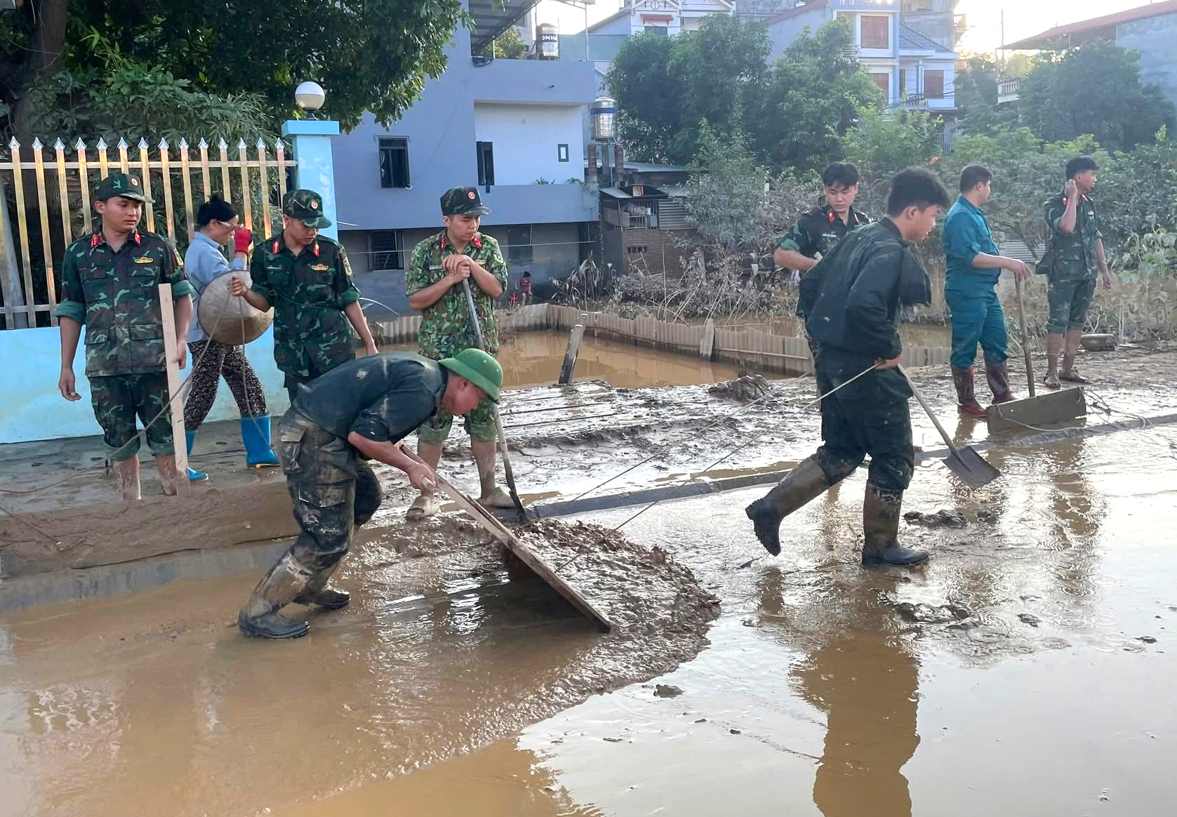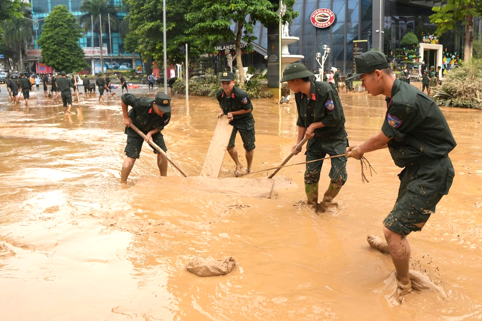 Mặc dù công việc nặng nhọc, bùn lầy ngập tới đầu gối, nhưng các chiến sĩ vẫn miệt mài làm việc, vận chuyển rác thải, khơi thông cống rãnh, nạo vét bùn để trả lại đường phố thông thoáng, sạch sẽ