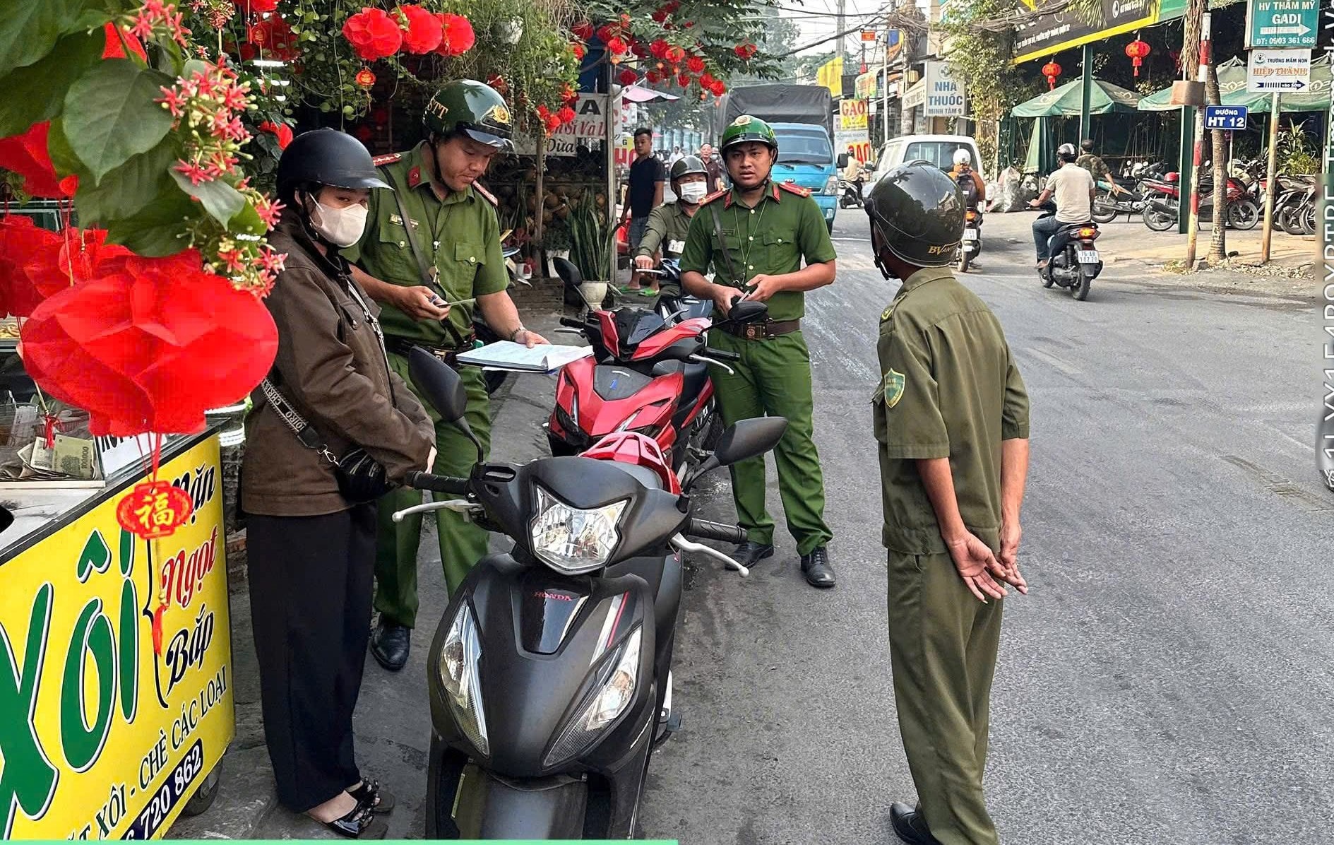 Công an phường Tân Thới Hiệp xử phạt người để xe không đúng nơi quy định. Ảnh: H.Hà.